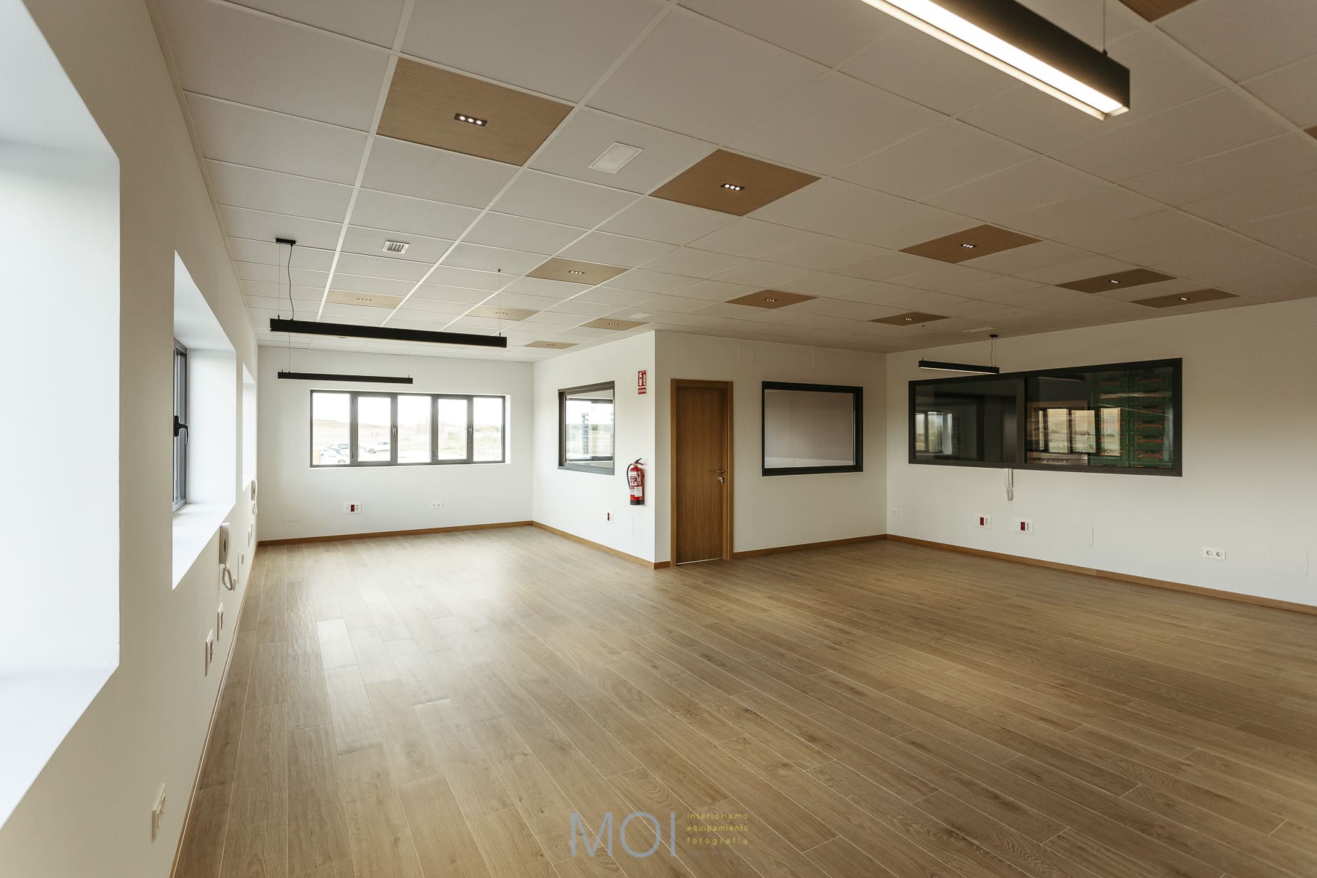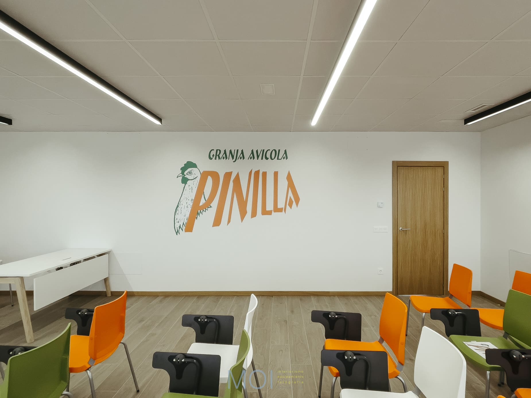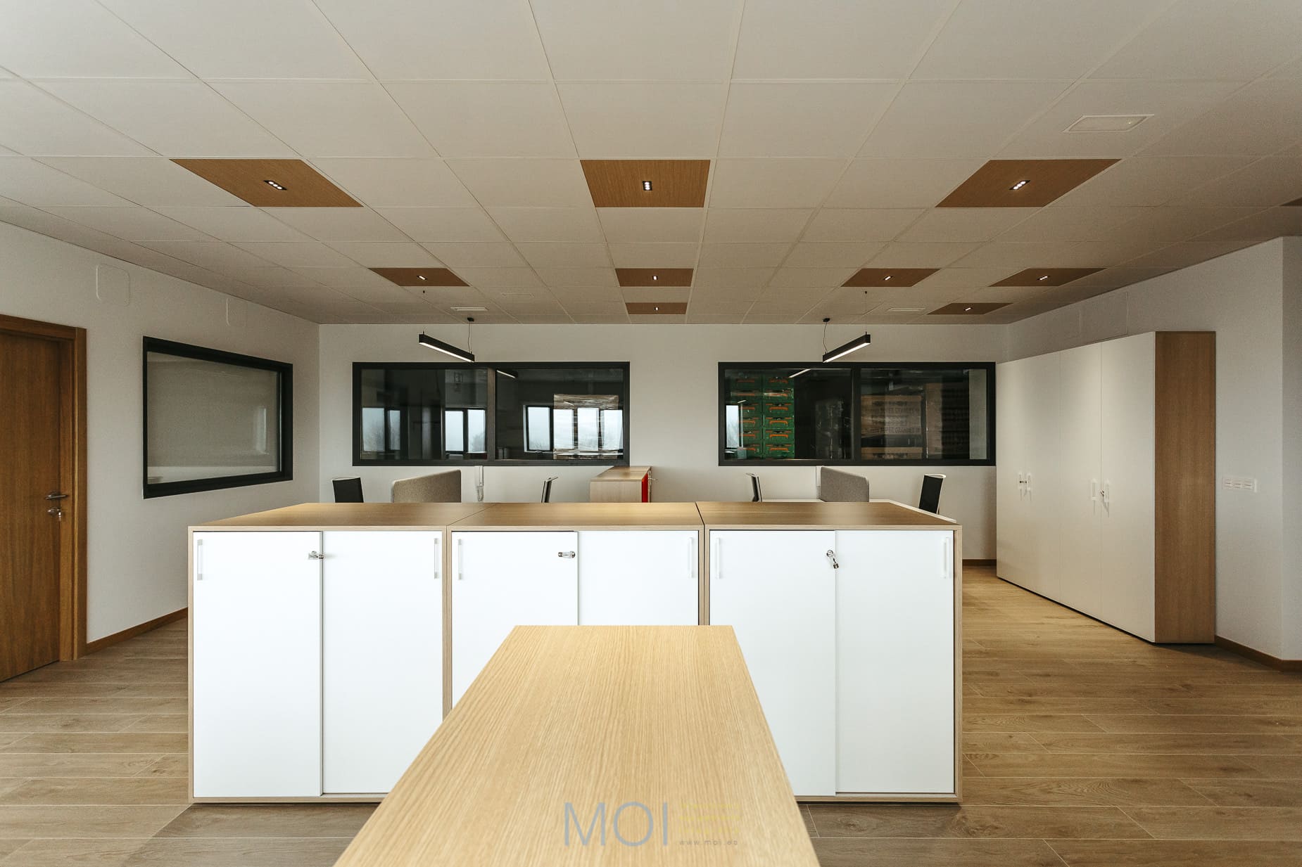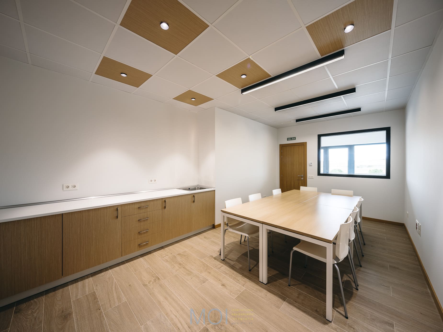 Hemos suministrado los puestos de trabajo, tanto en bench como en despachos; zonas nobles como la sala de reuniones y el despacho de dirección; salas multifuncionales que pueden usarse tanto como comedor o como pequeña aula polivalente; la gran sala de formación; la enfermería y todos los muebles de baño, mamparas y accesorios; office de comedor; estanterías y encimeras fenólicas en aseos de personal de fábrica…