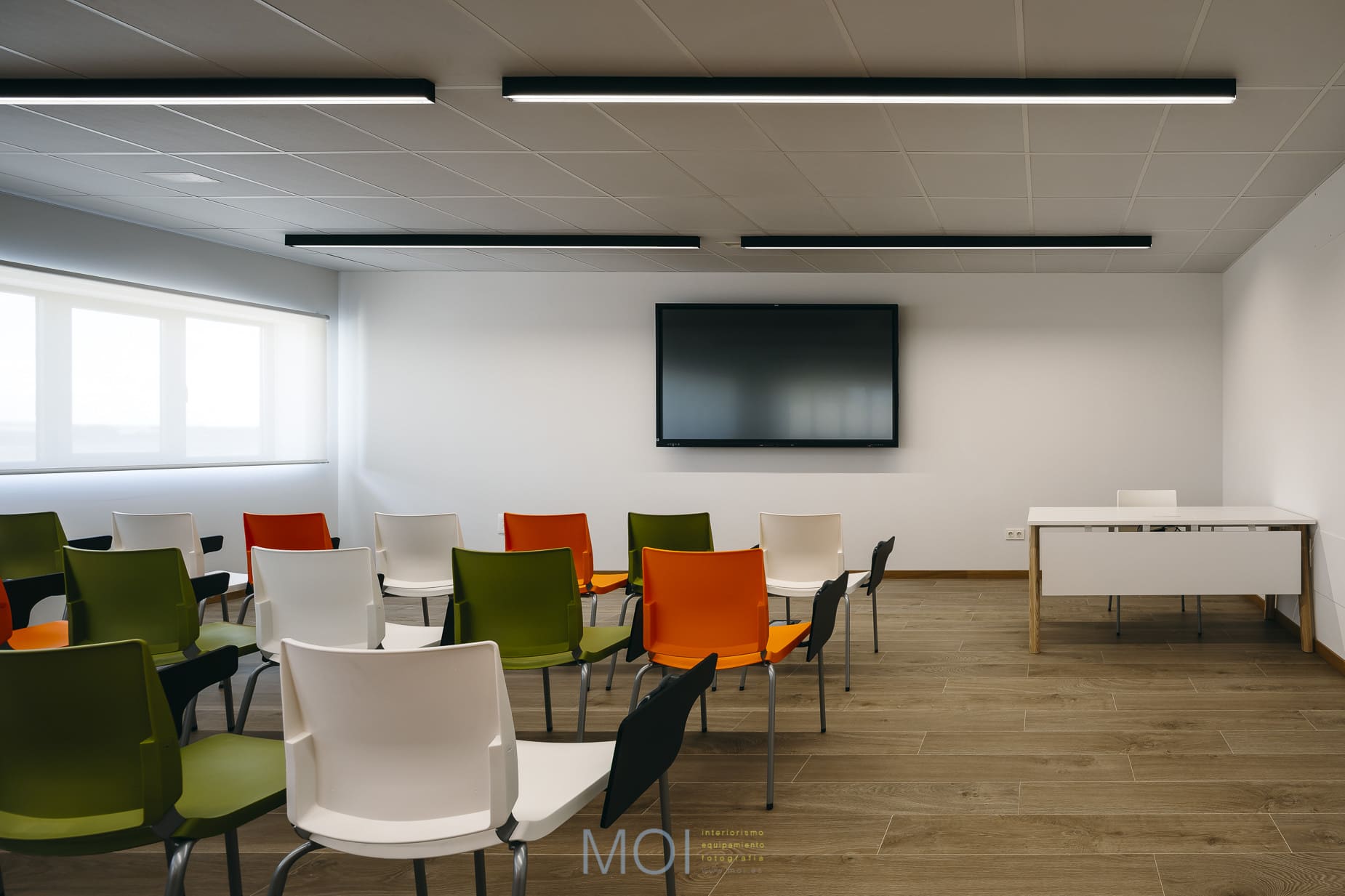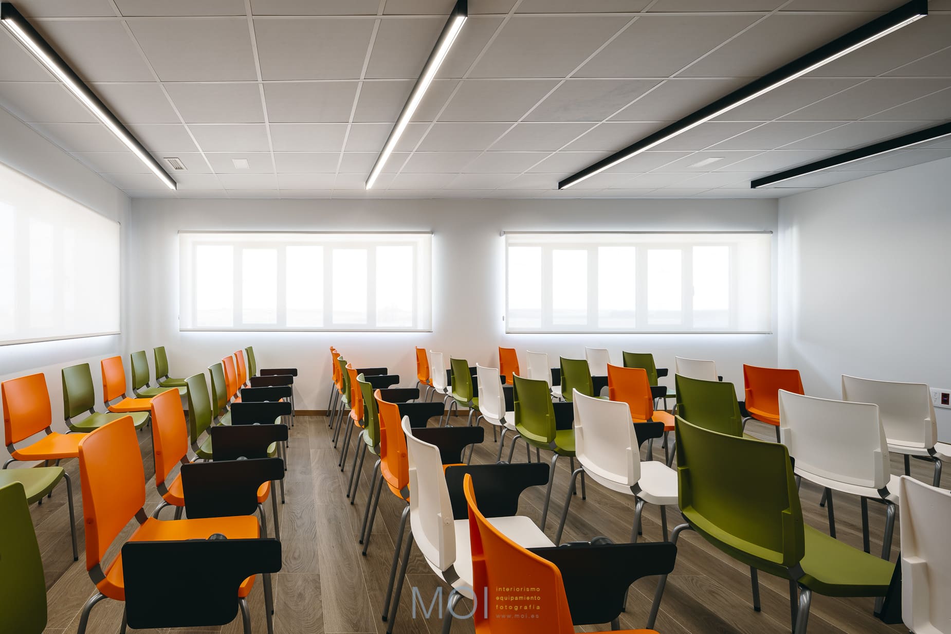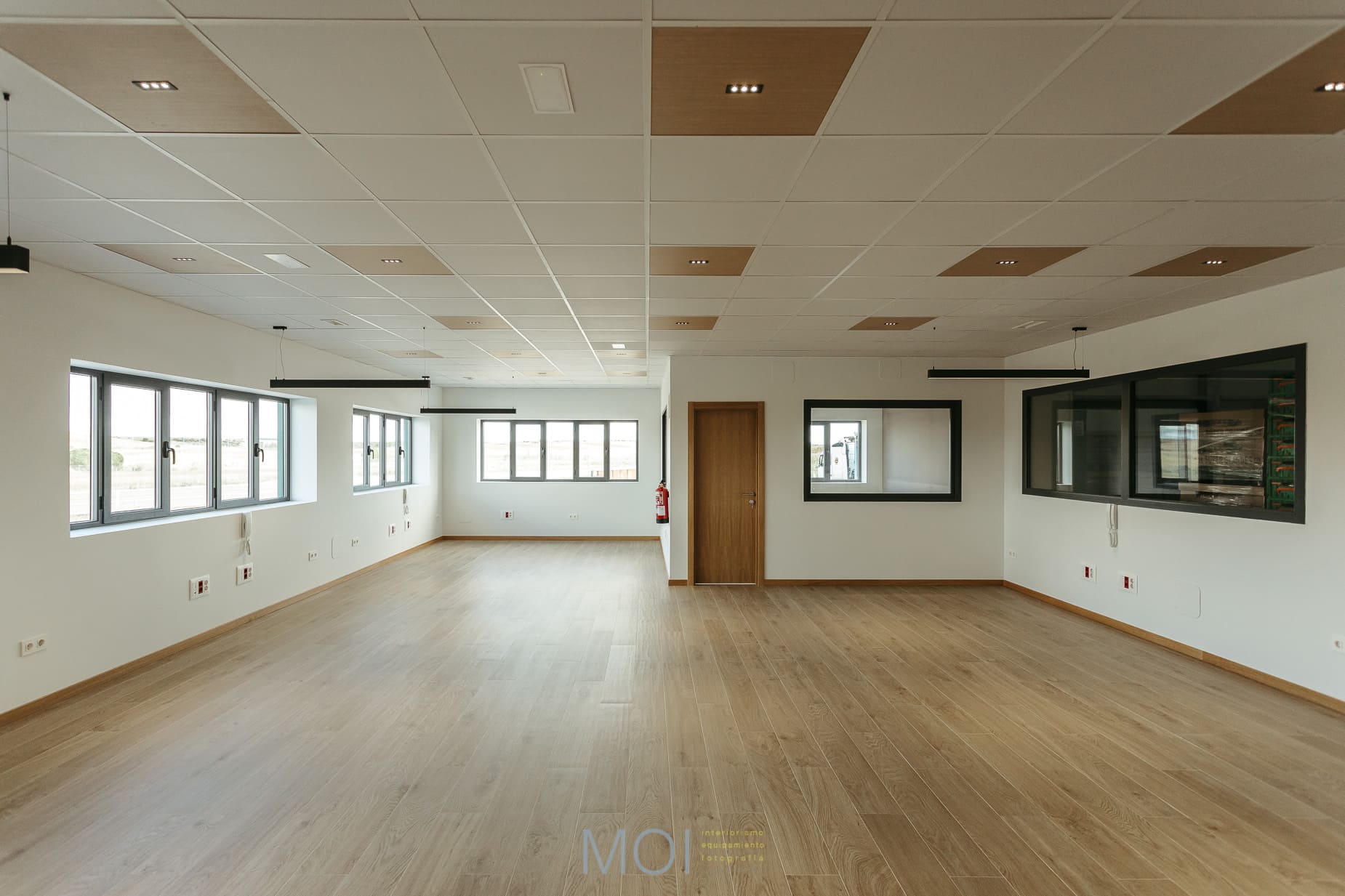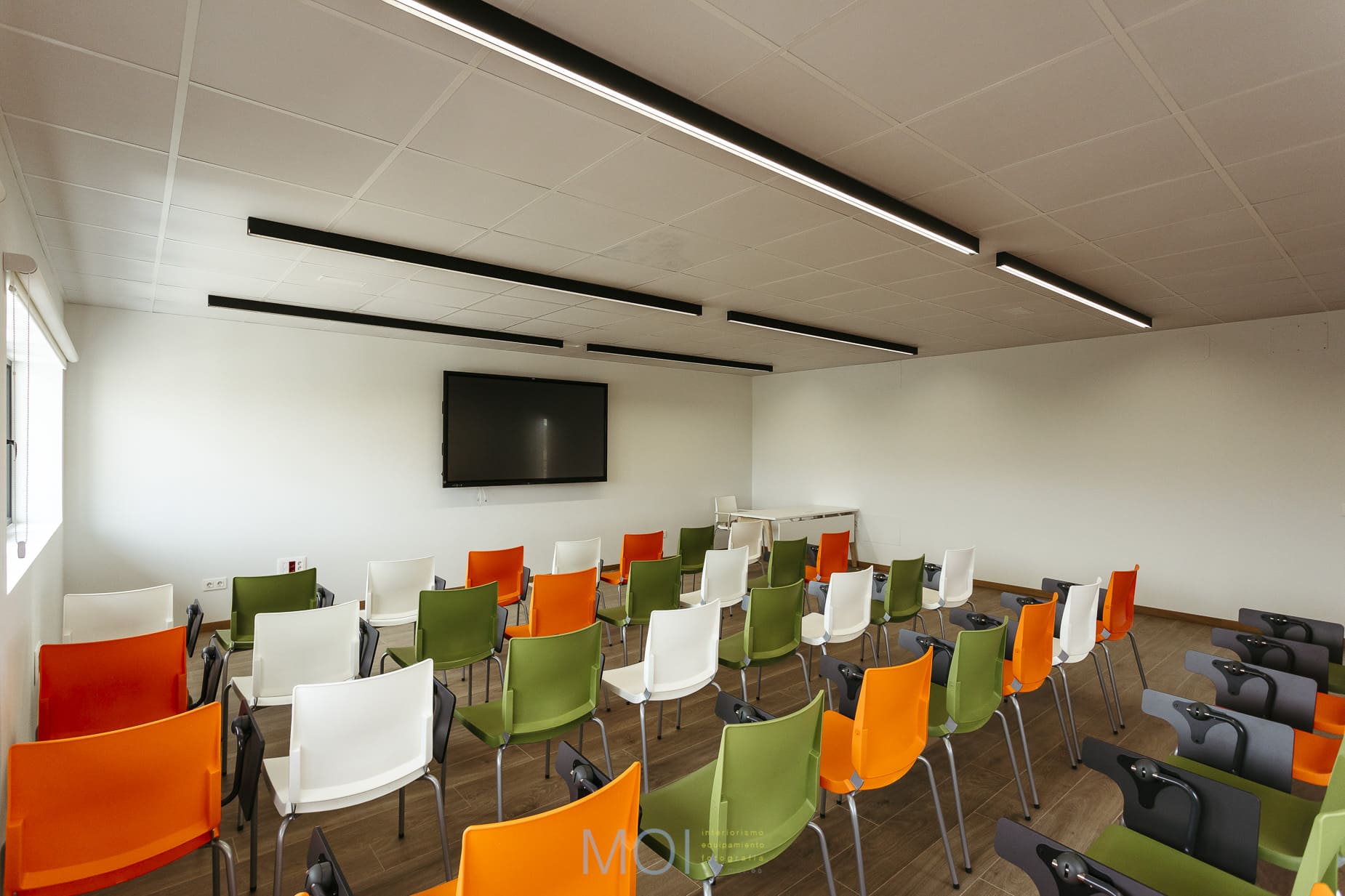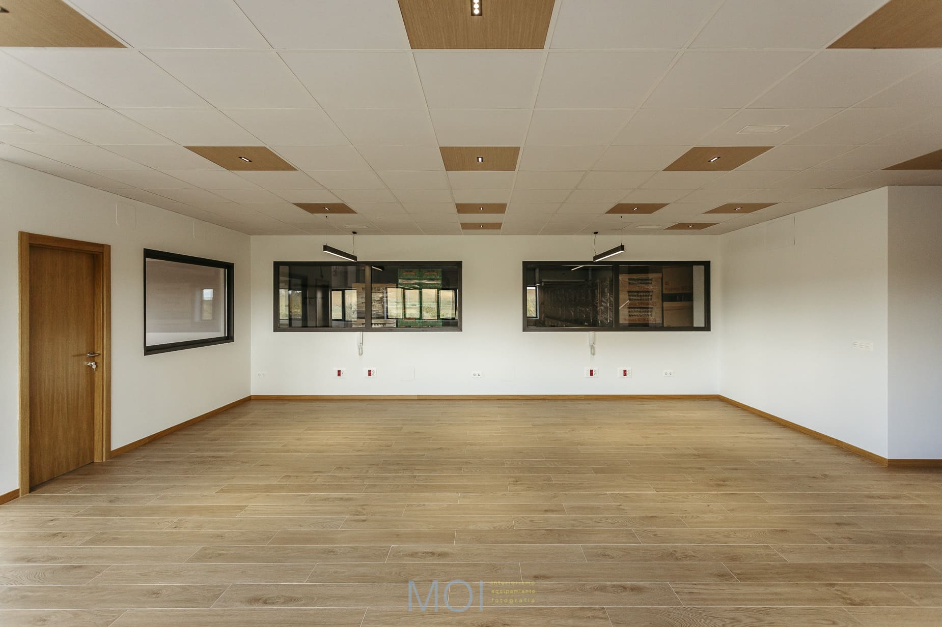 Hemos suministrado los puestos de trabajo, tanto en bench como en despachos; zonas nobles como la sala de reuniones y el despacho de dirección; salas multifuncionales que pueden usarse tanto como comedor o como pequeña aula polivalente; la gran sala de formación; la enfermería y todos los muebles de baño, mamparas y accesorios; office de comedor; estanterías y encimeras fenólicas en aseos de personal de fábrica…