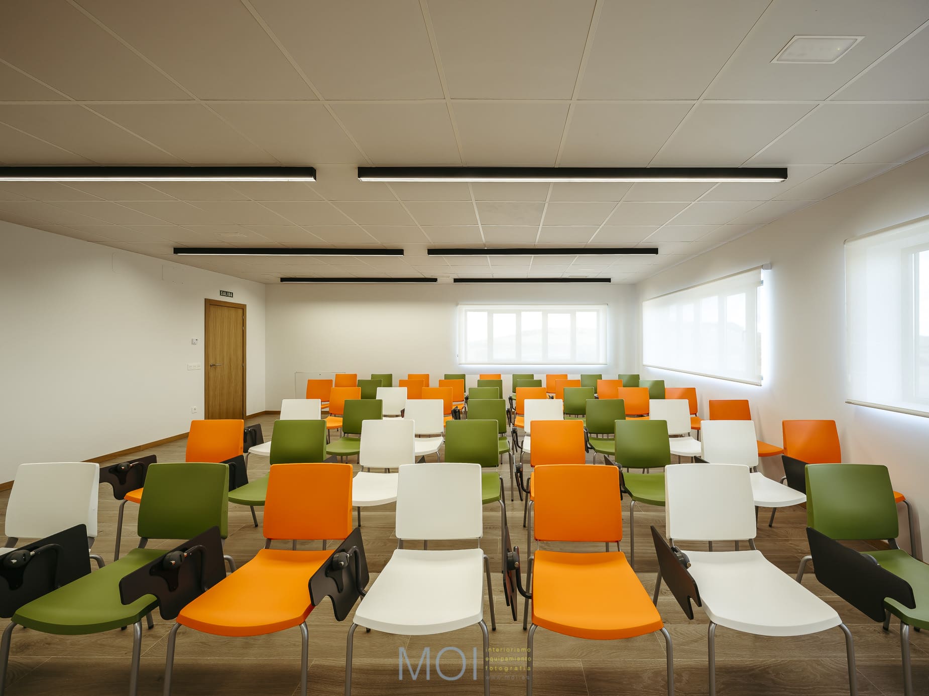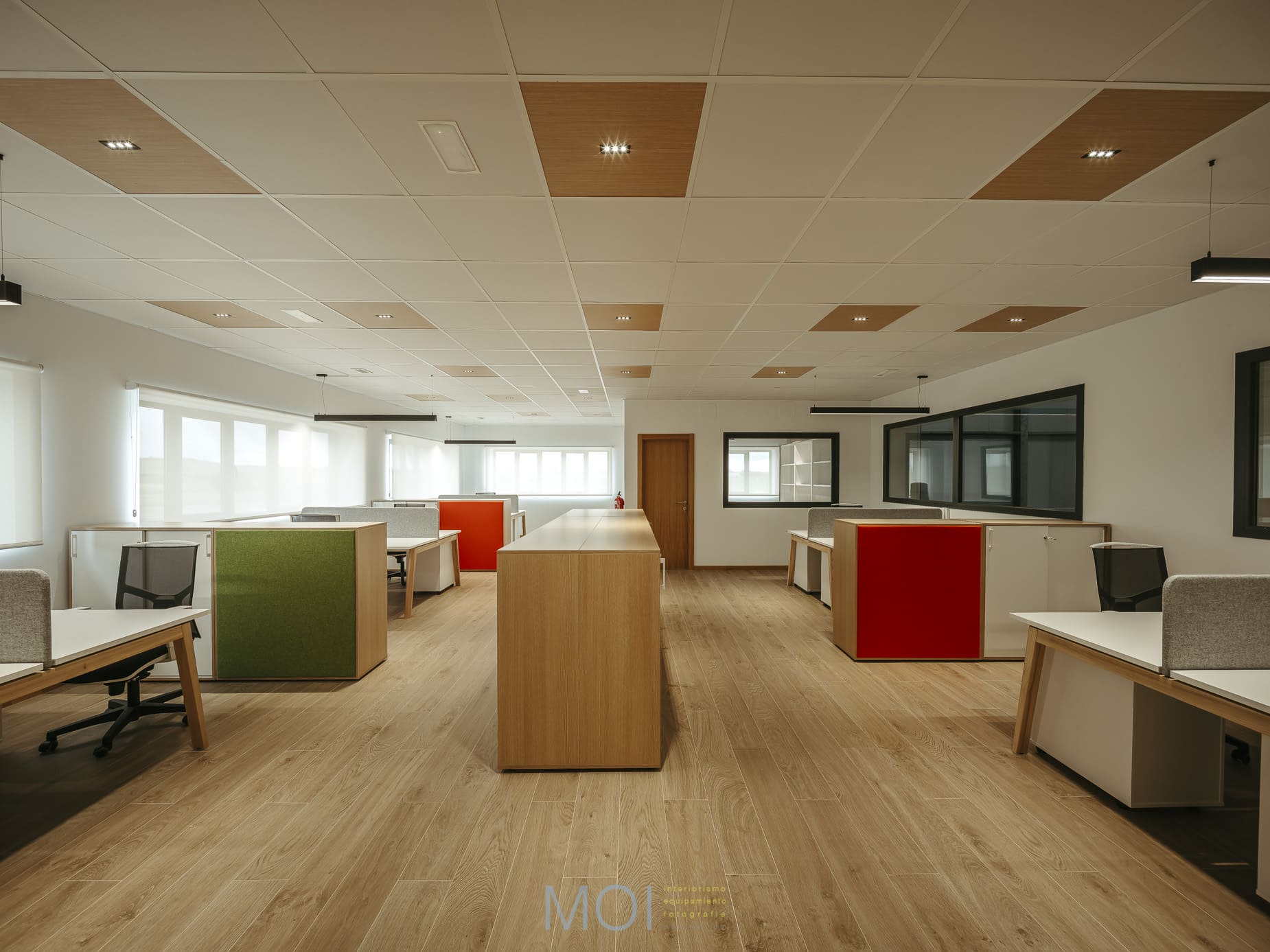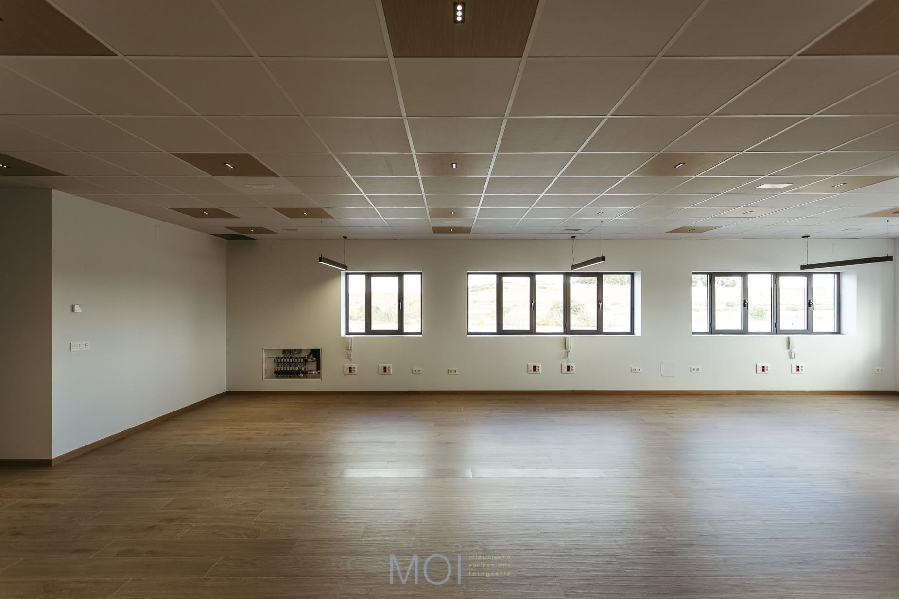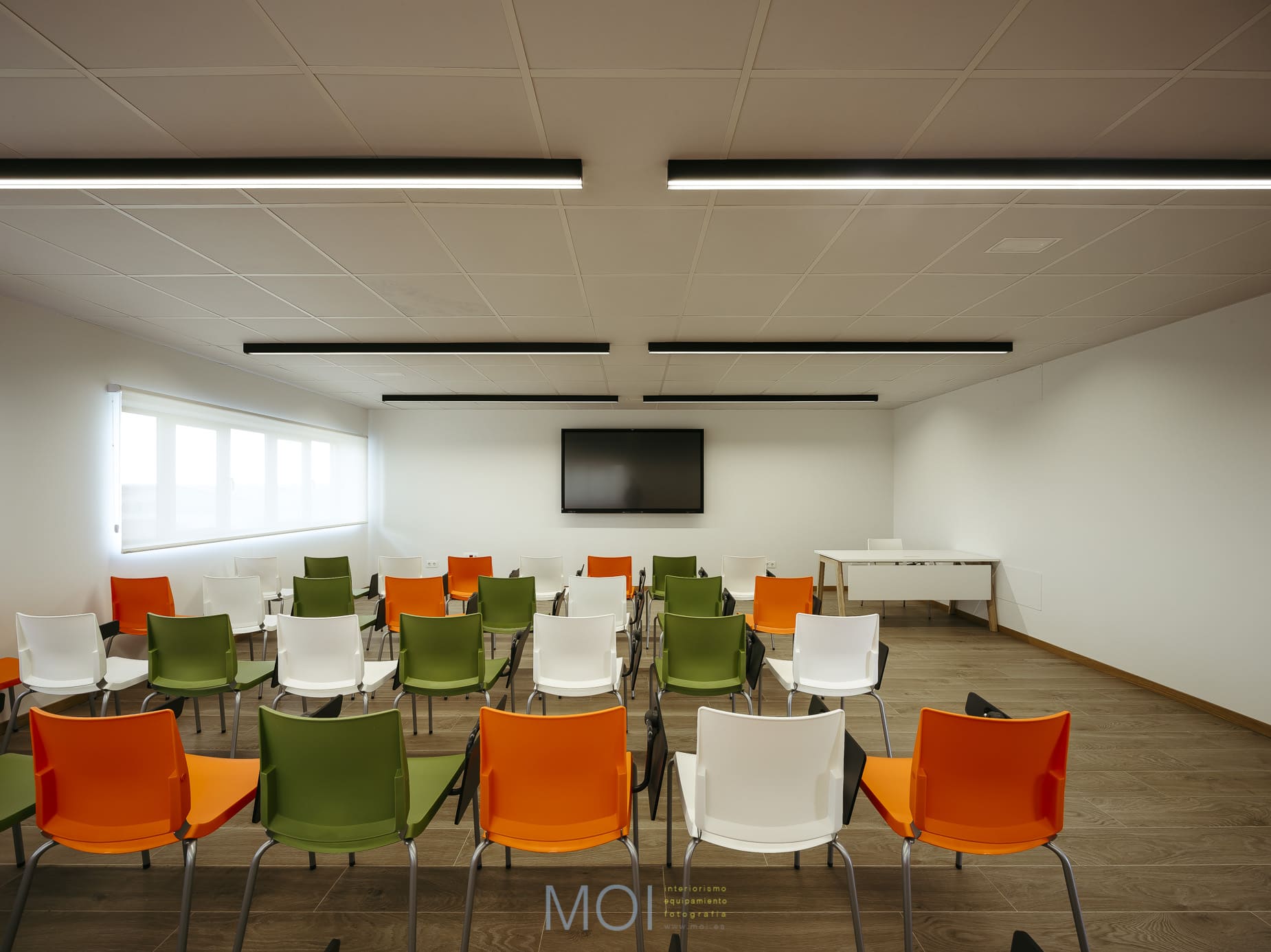 Hemos suministrado los puestos de trabajo, tanto en bench como en despachos; zonas nobles como la sala de reuniones y el despacho de dirección; salas multifuncionales que pueden usarse tanto como comedor o como pequeña aula polivalente; la gran sala de formación; la enfermería y todos los muebles de baño, mamparas y accesorios; office de comedor; estanterías y encimeras fenólicas en aseos de personal de fábrica…
