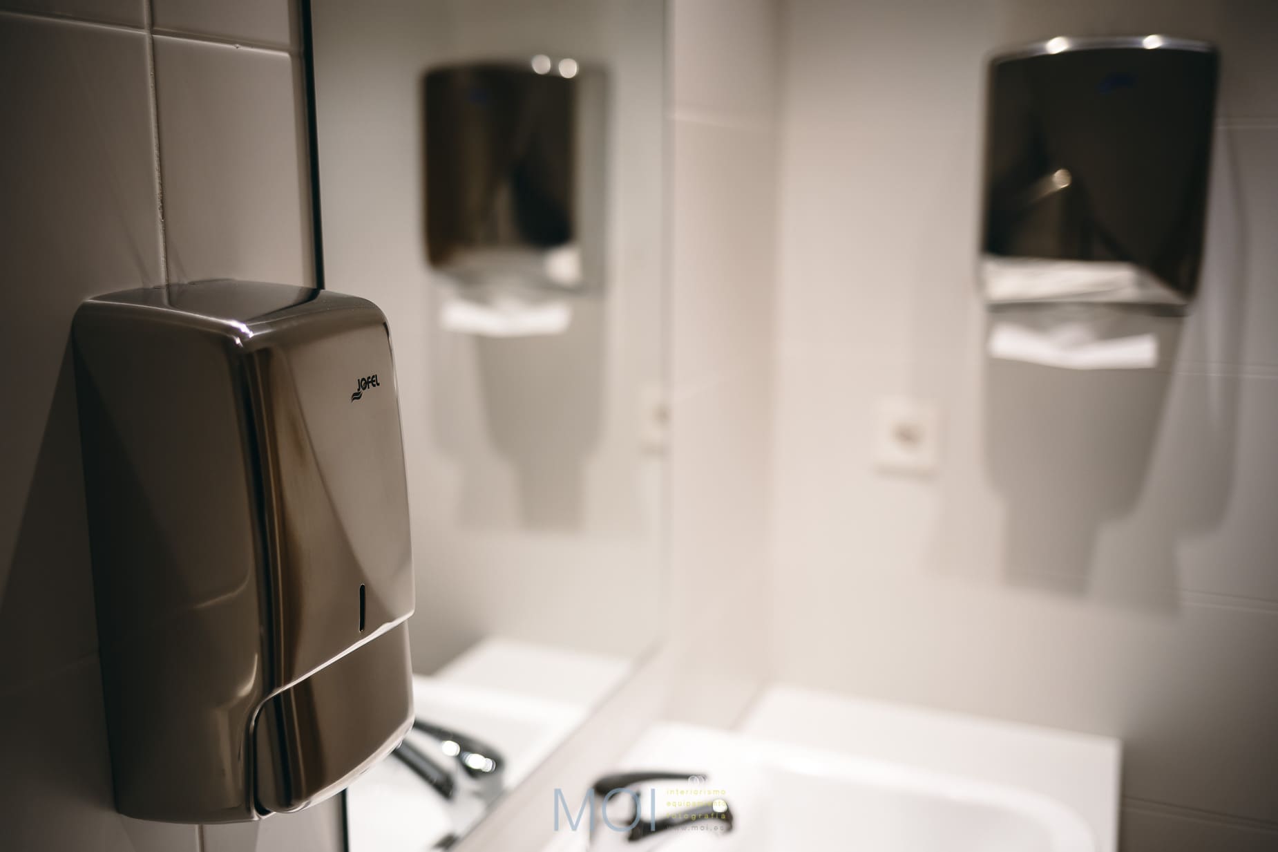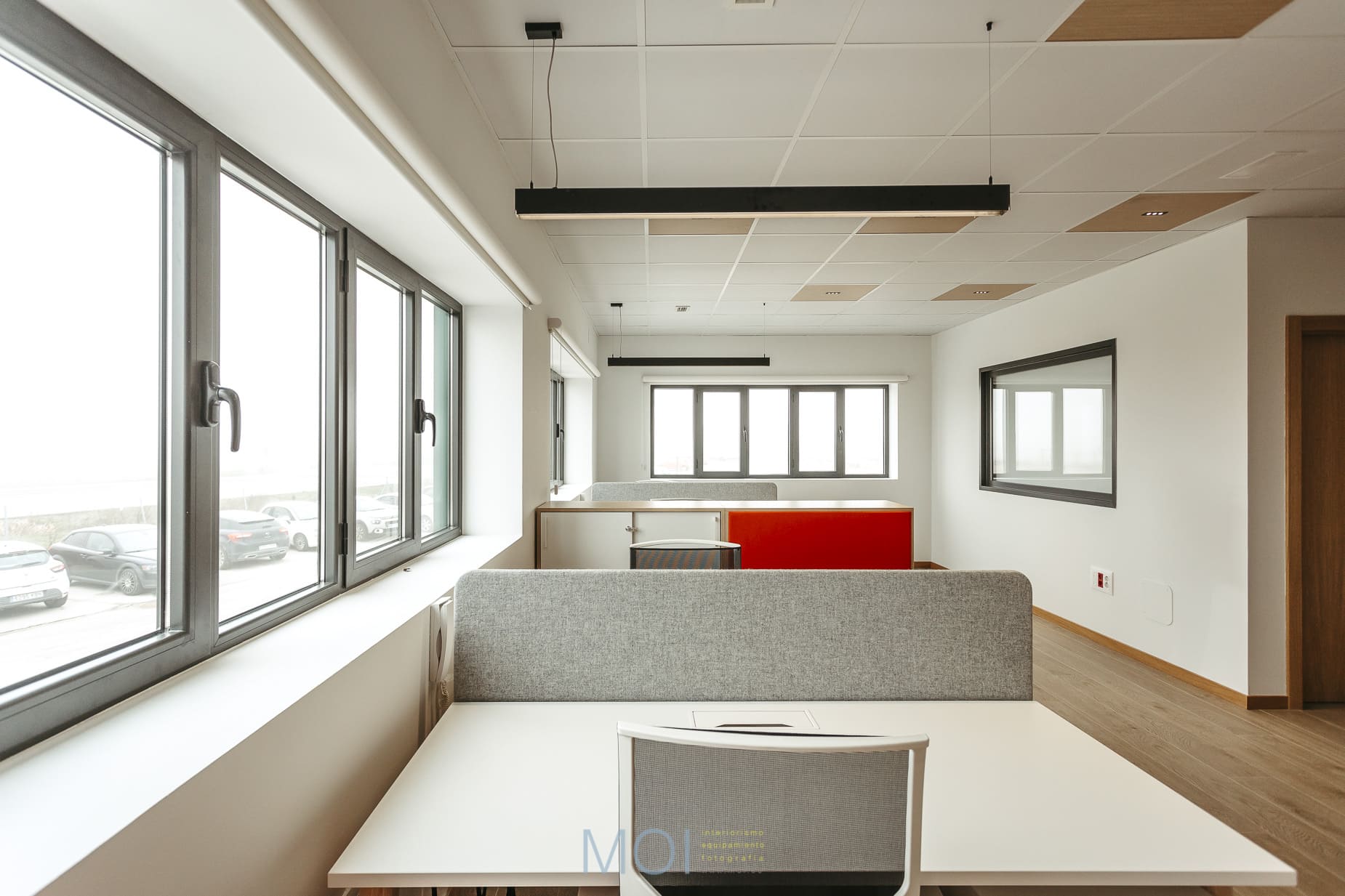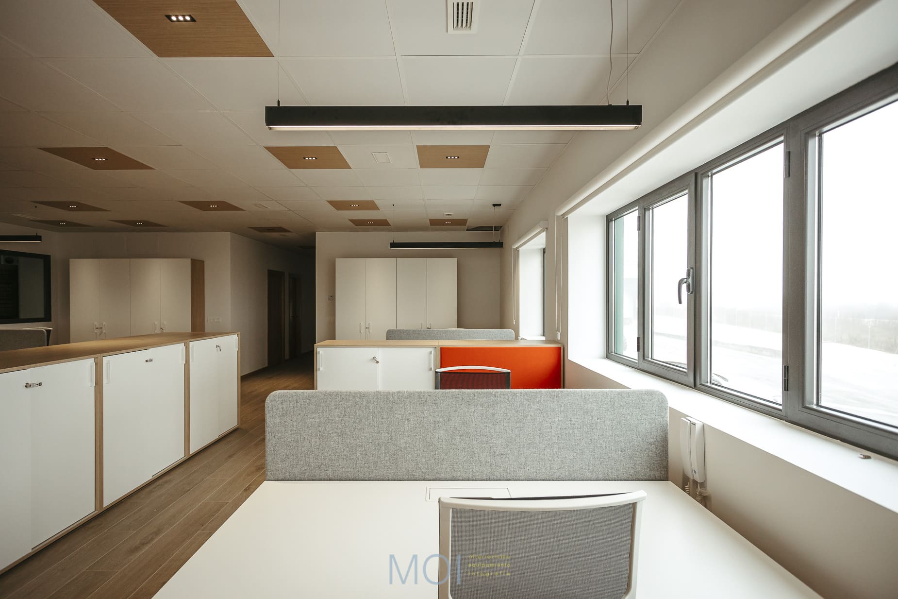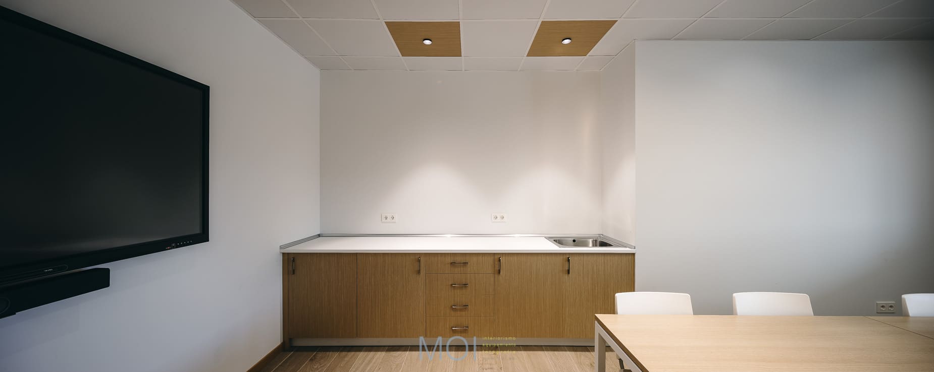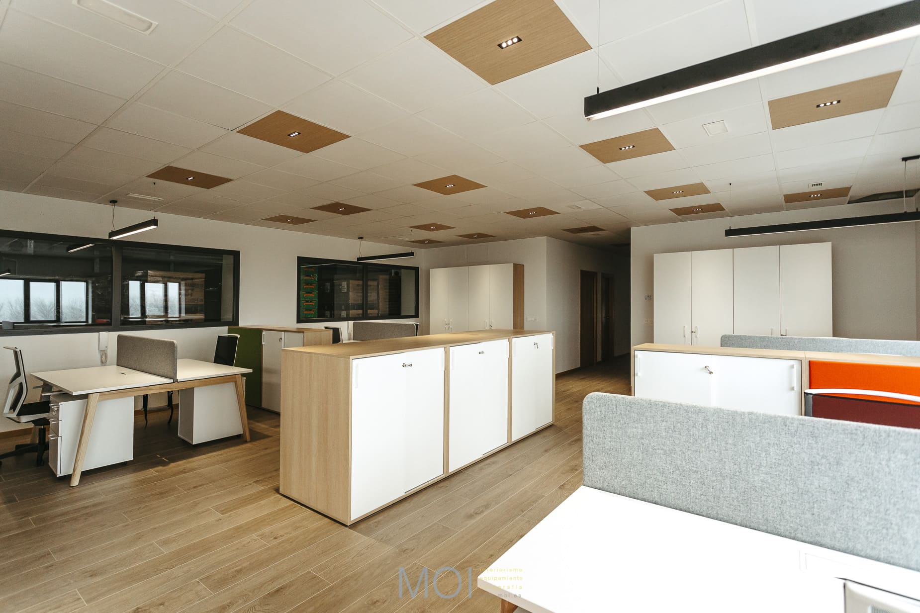 Hemos suministrado los puestos de trabajo, tanto en bench como en despachos; zonas nobles como la sala de reuniones y el despacho de dirección; salas multifuncionales que pueden usarse tanto como comedor o como pequeña aula polivalente; la gran sala de formación; la enfermería y todos los muebles de baño, mamparas y accesorios; office de comedor; estanterías y encimeras fenólicas en aseos de personal de fábrica…
