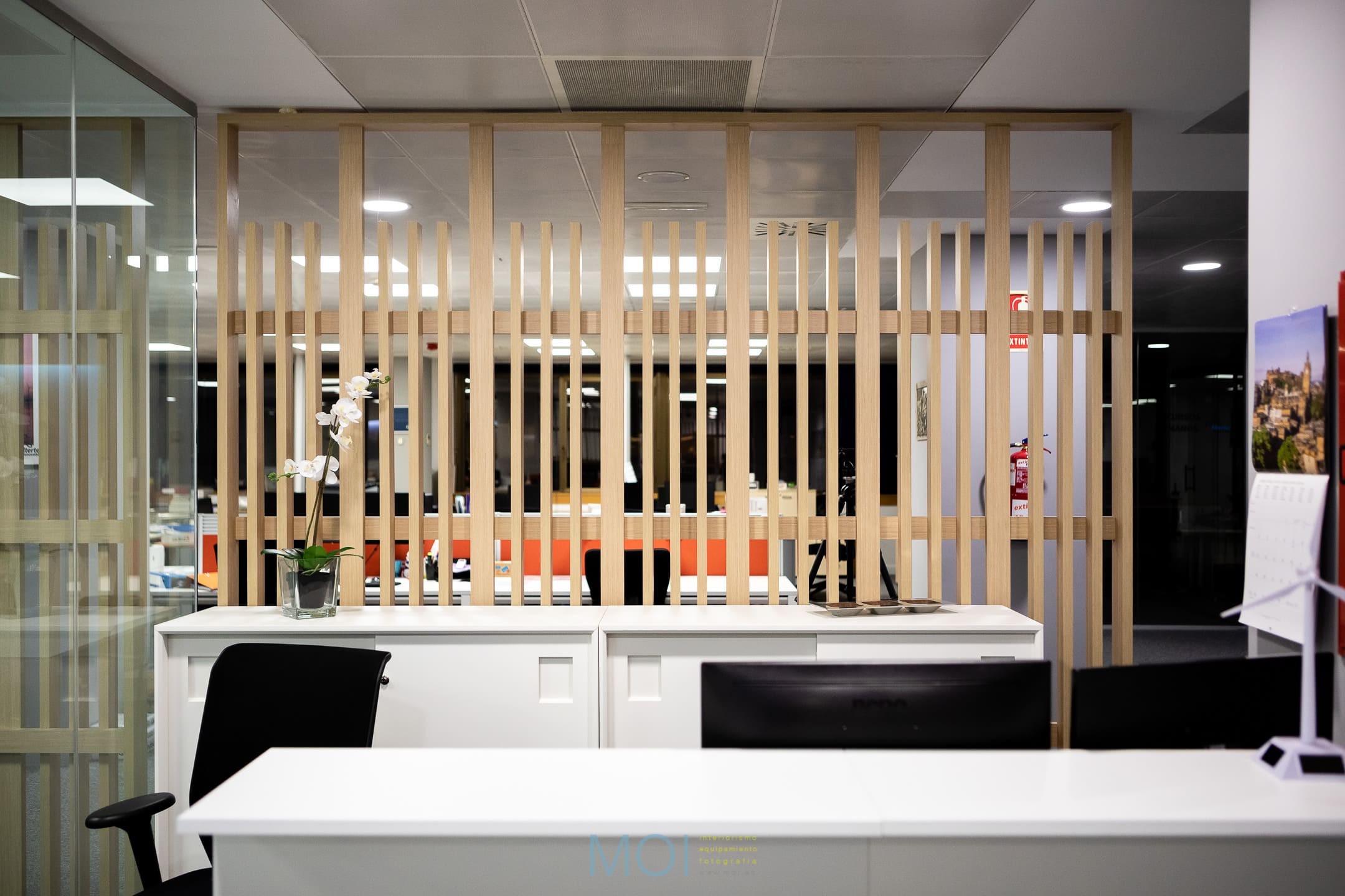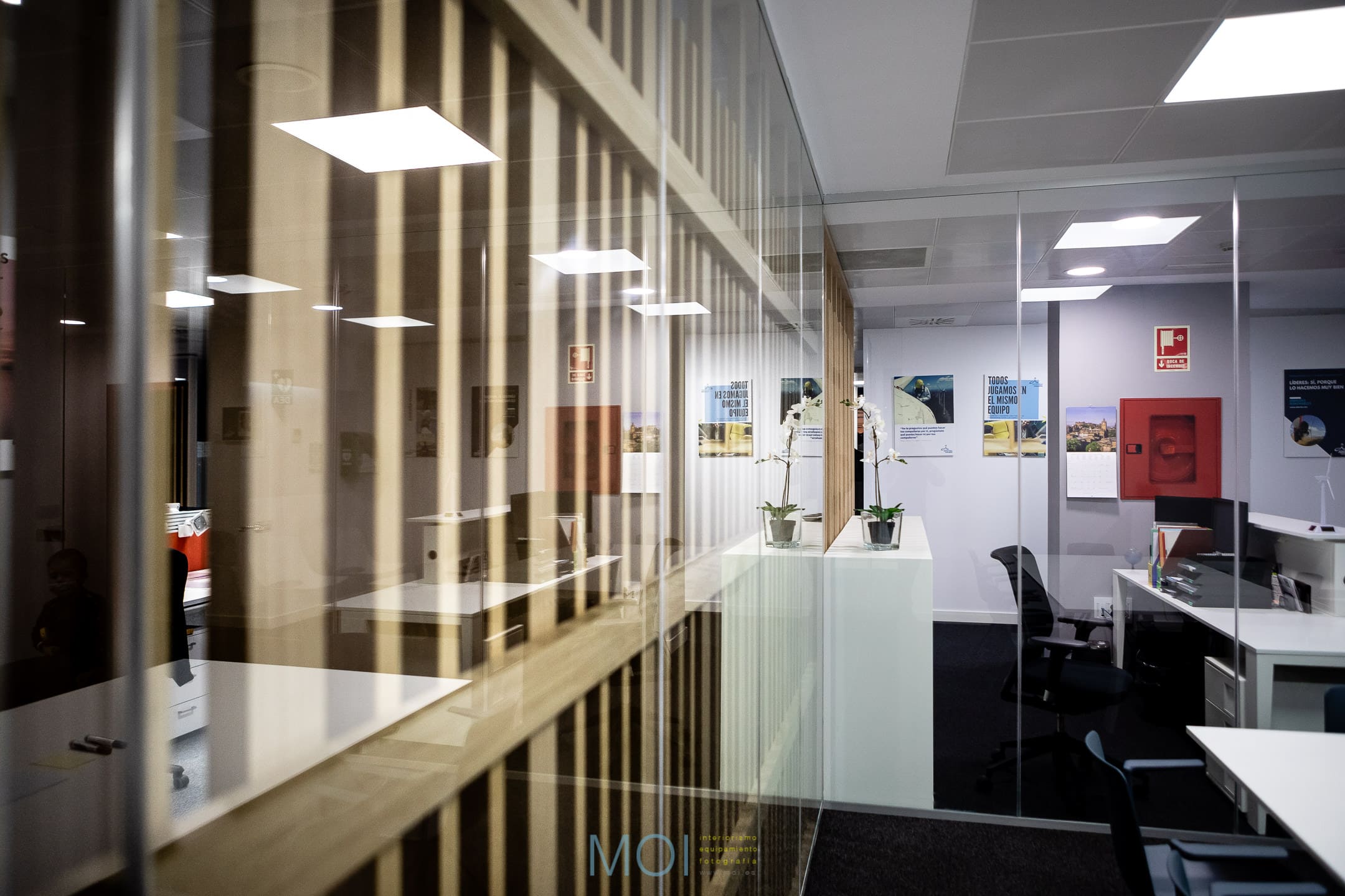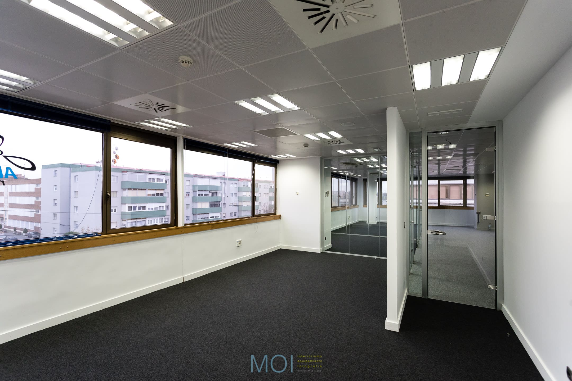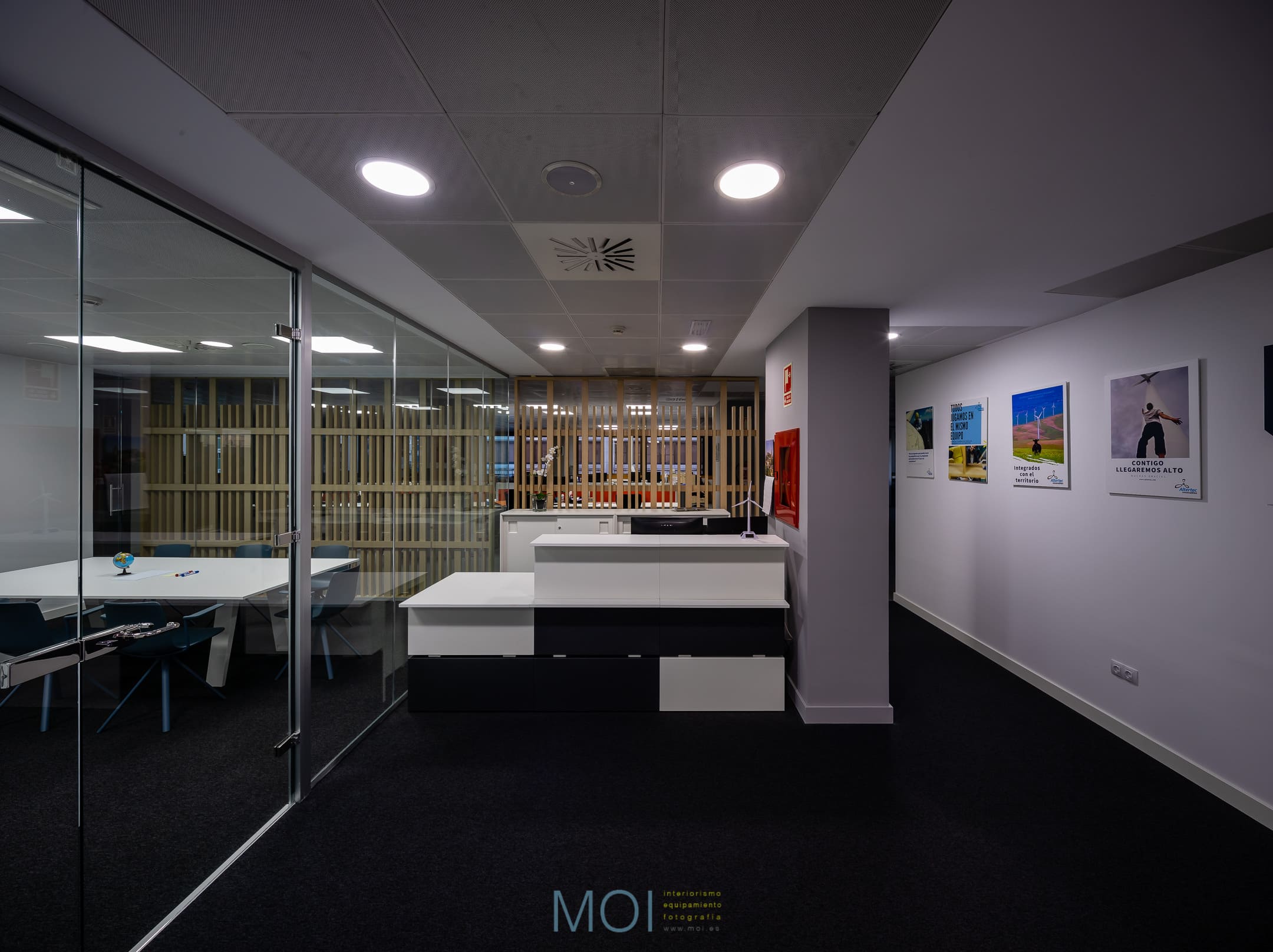 Se hizo una pequeña reforma redistribuyendo espacios adecuándolos a las necesidades del cliente, eliminando tabiquería, creando nuevas zonas con particiones tanto de vidrio como de yeso laminado, modificando las mamparas existentes, etc. Se instaló un pavimento de moqueta, se repararon zonas de techo acústico, también se instalaron celosías para cualificar espacios y proporcionar ámbitos más privados. Se trató de aprovechar al máximo el mobiliario operativo existente y se equiparon con nuevos elementos la zona de recepción, salas de reuniones y algún despacho (mesas, sillas, butacas, mostrador, complementos…).