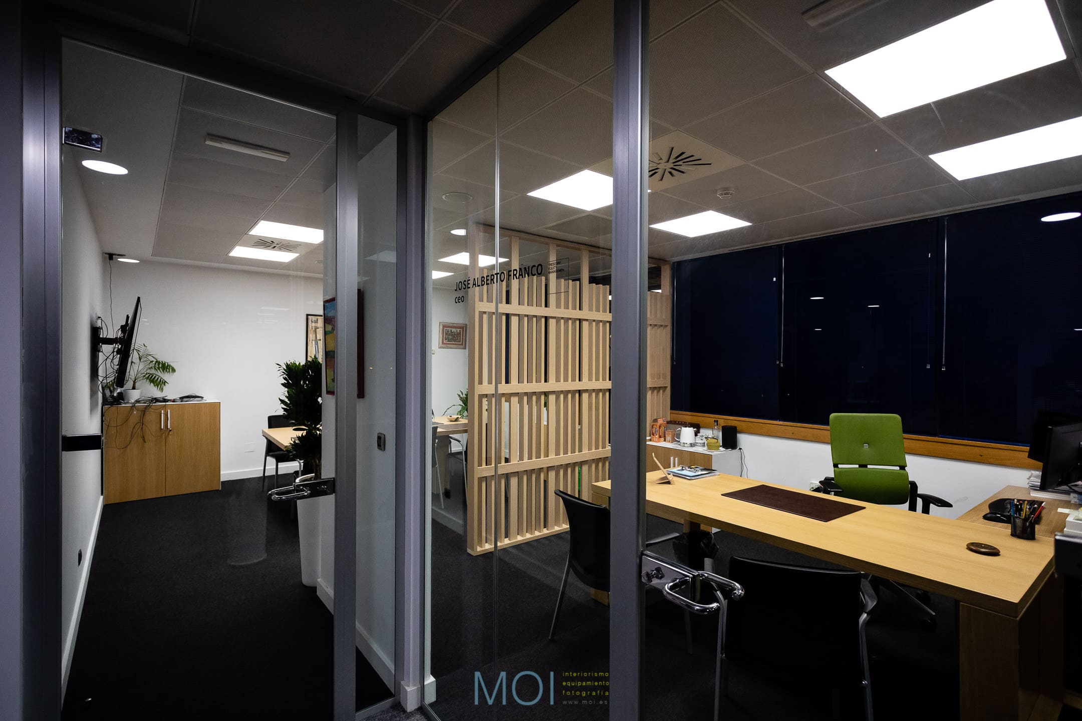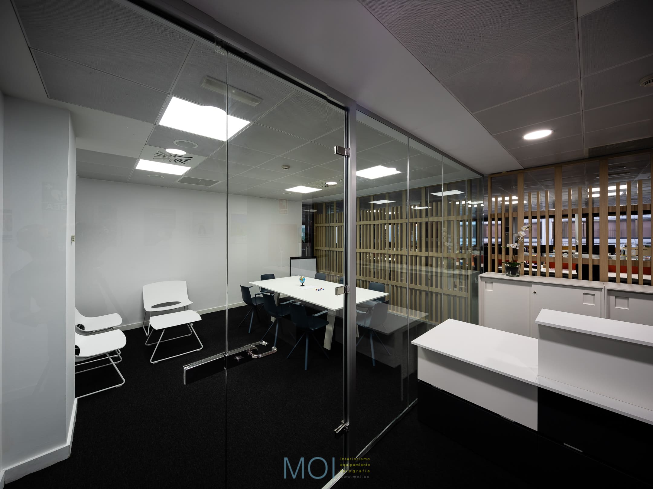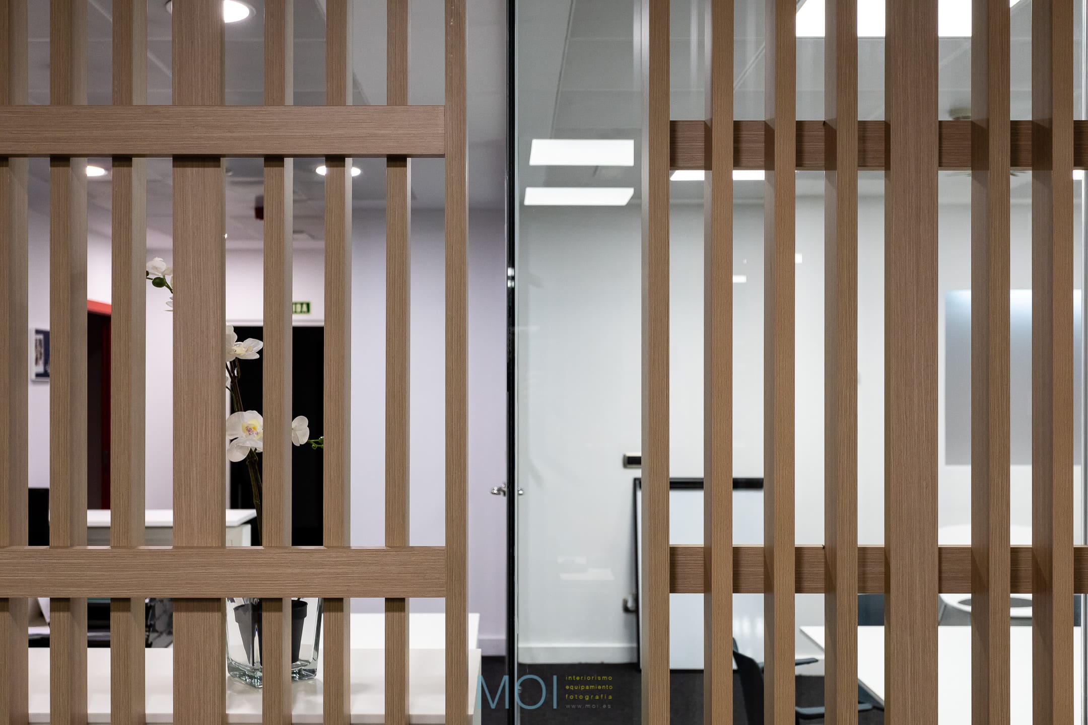 Se hizo una pequeña reforma redistribuyendo espacios adecuándolos a las necesidades del cliente, eliminando tabiquería, creando nuevas zonas con particiones tanto de vidrio como de yeso laminado, modificando las mamparas existentes, etc. Se instaló un pavimento de moqueta, se repararon zonas de techo acústico, también se instalaron celosías para cualificar espacios y proporcionar ámbitos más privados. Se trató de aprovechar al máximo el mobiliario operativo existente y se equiparon con nuevos elementos la zona de recepción, salas de reuniones y algún despacho (mesas, sillas, butacas, mostrador, complementos…).