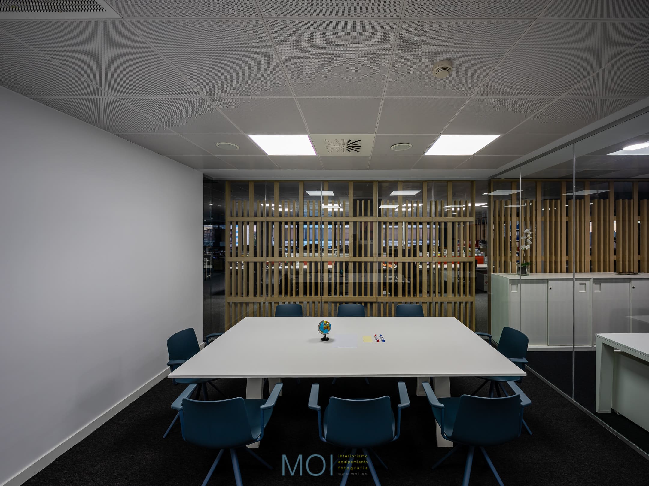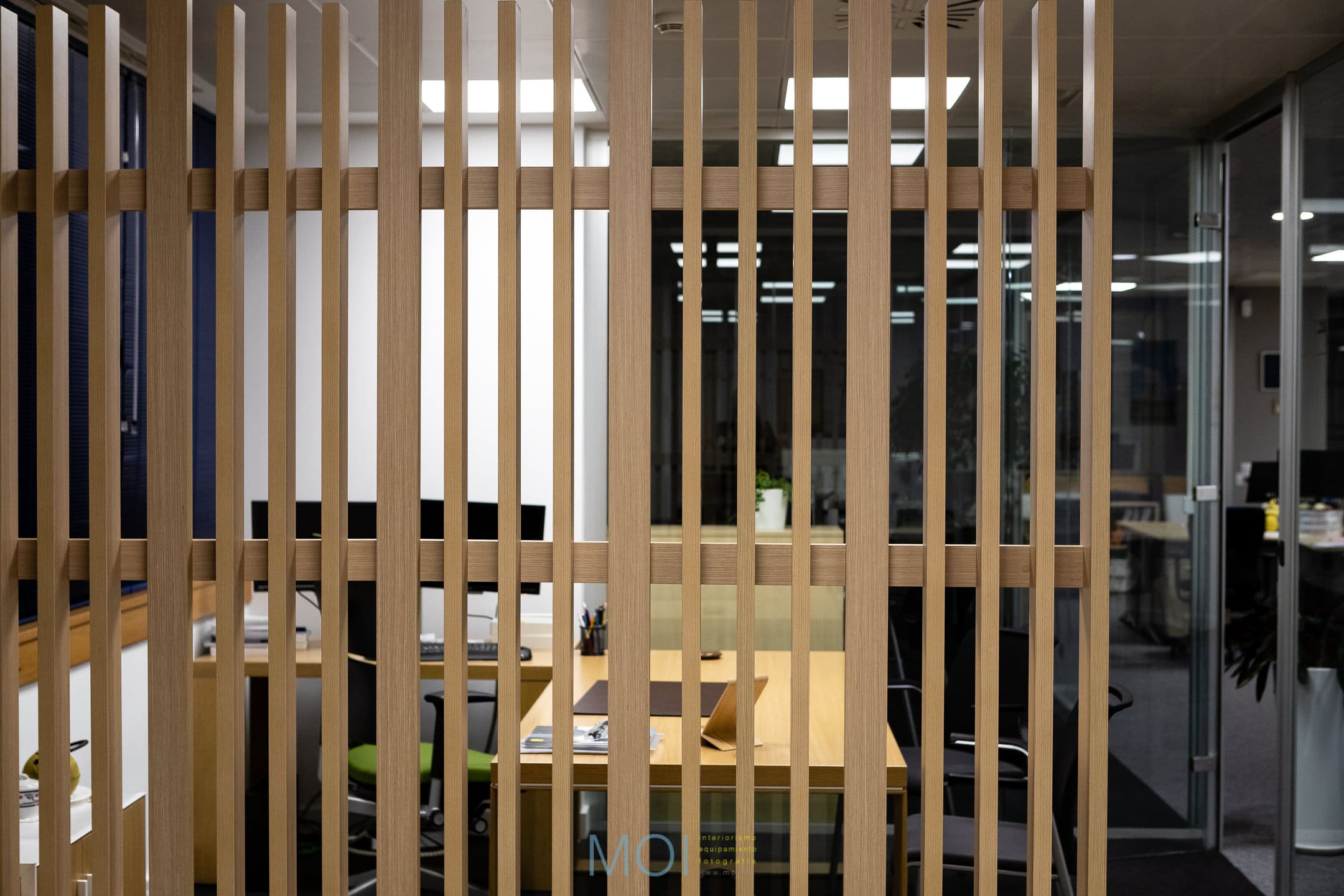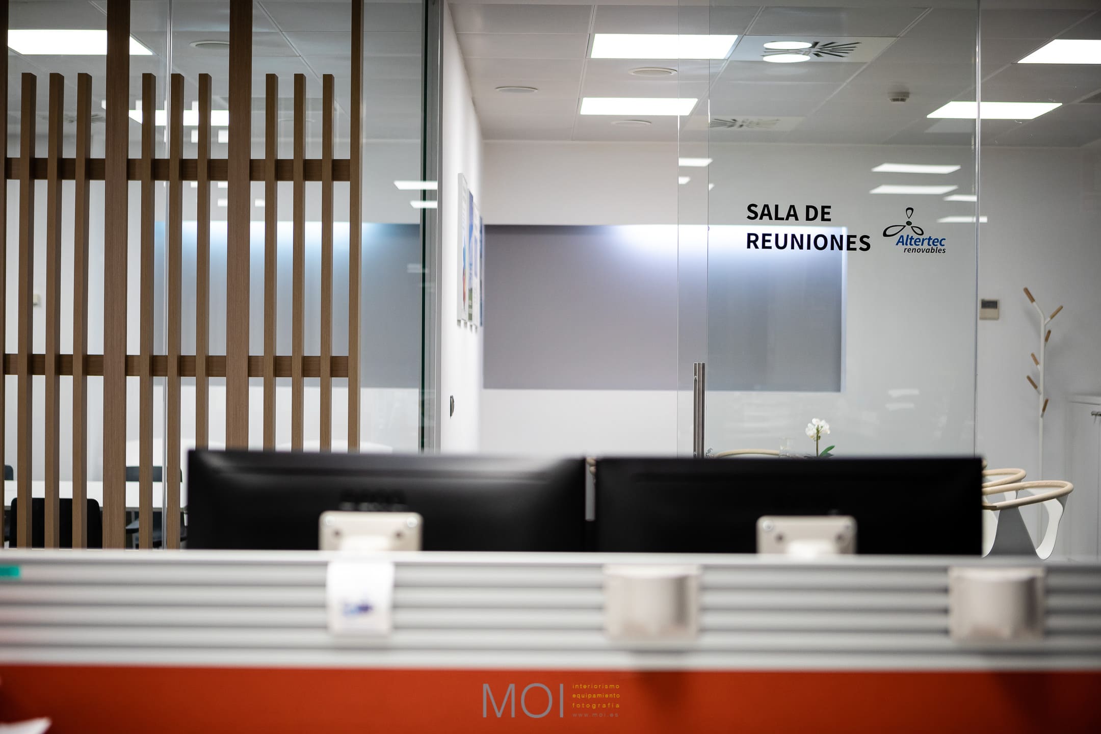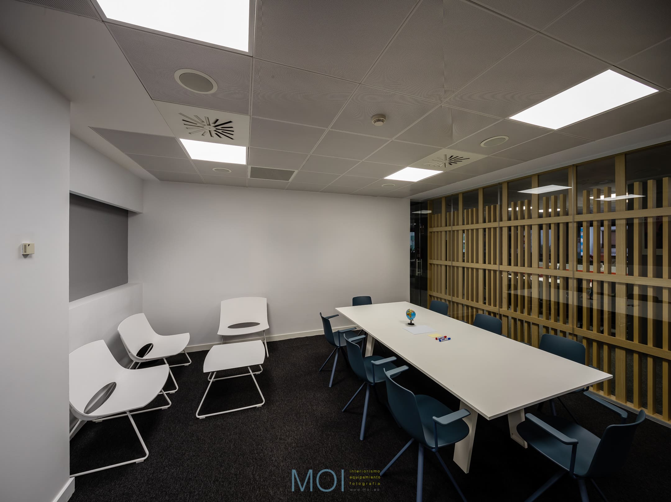Se hizo una pequeña reforma redistribuyendo espacios adecuándolos a las necesidades del cliente, eliminando tabiquería, creando nuevas zonas con particiones tanto de vidrio como de yeso laminado, modificando las mamparas existentes, etc. Se instaló un pavimento de moqueta, se repararon zonas de techo acústico, también se instalaron celosías para cualificar espacios y proporcionar ámbitos más privados. Se trató de aprovechar al máximo el mobiliario operativo existente y se equiparon con nuevos elementos la zona de recepción, salas de reuniones y algún despacho (mesas, sillas, butacas, mostrador, complementos…).