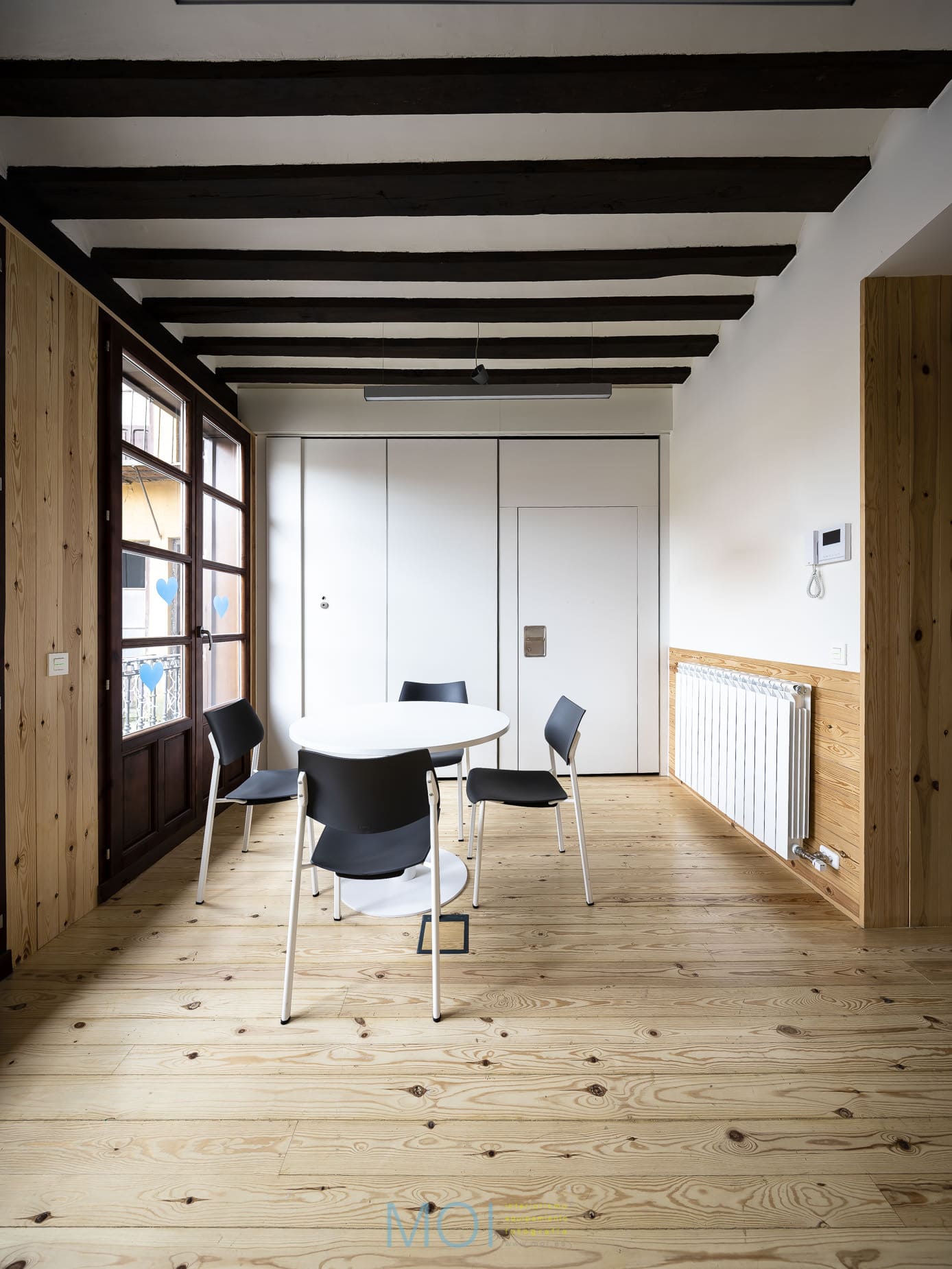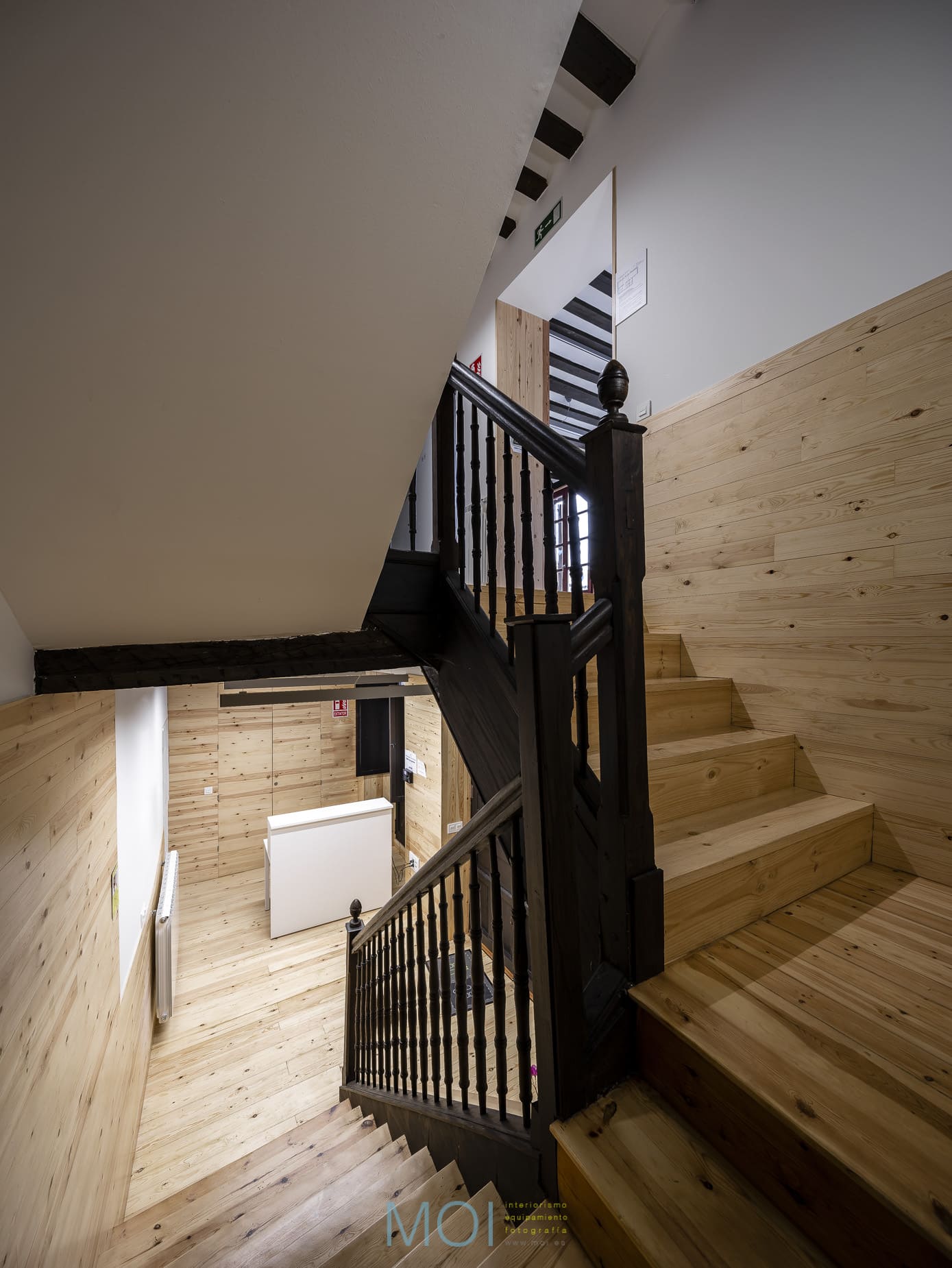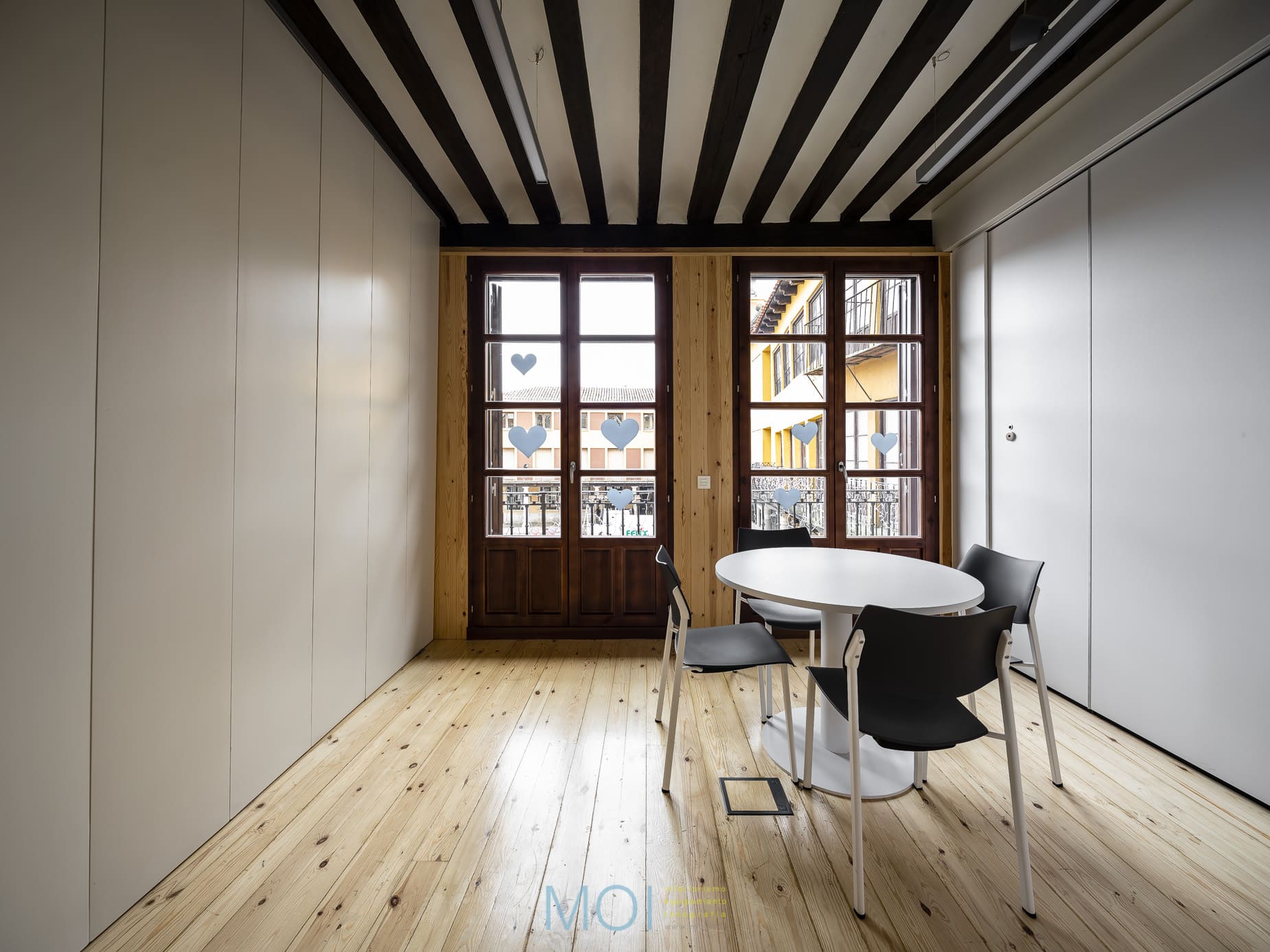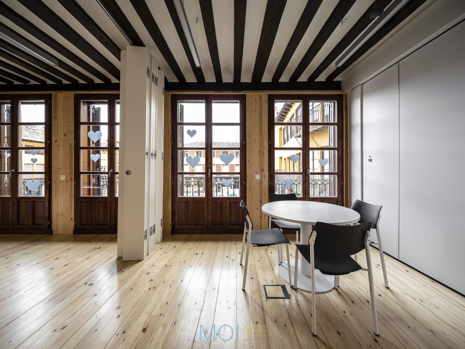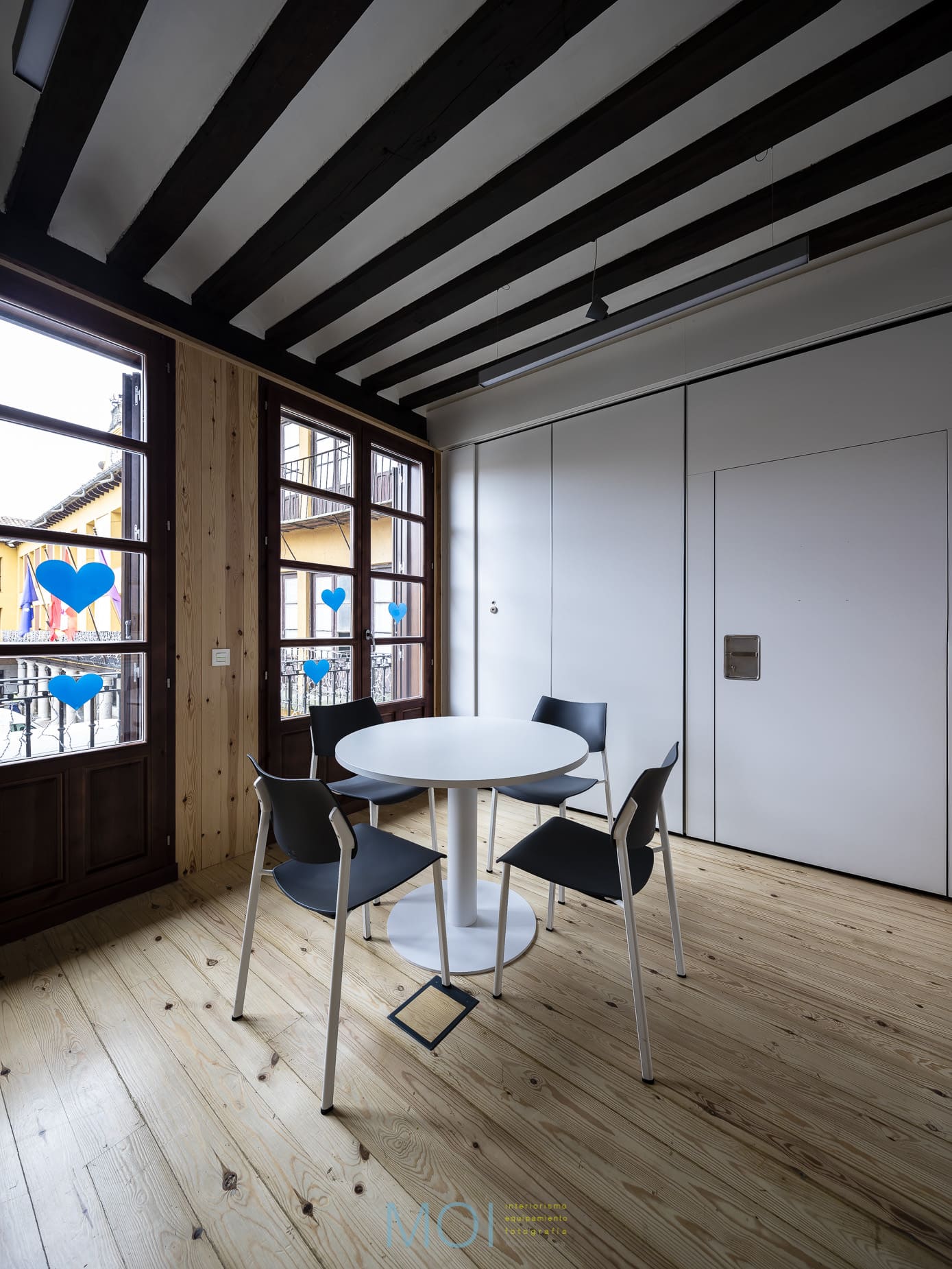 En toda la intervención el estudio de arquitectura tuvo muy presente el carácter que debía tener el centro. Se empleó la madera natural de pino tanto en suelo como en paramentos verticales logrando crear una atmósfera cálida y sensorial. Un espacio que, a pesar de ser reducido, presenta soluciones polivalentes que lo magnifican. Un espacio antiguo en el que una intervención moderna pone en valor las preexistencias y recupera un edificio en un entorno tan singular y complejo como la plaza mayor de Tordesillas. Y, lo más importante: un espacio que se muestra útil y adecuado para sus usuarios que encuentran el confort necesario para desarrollar en él su actividad.