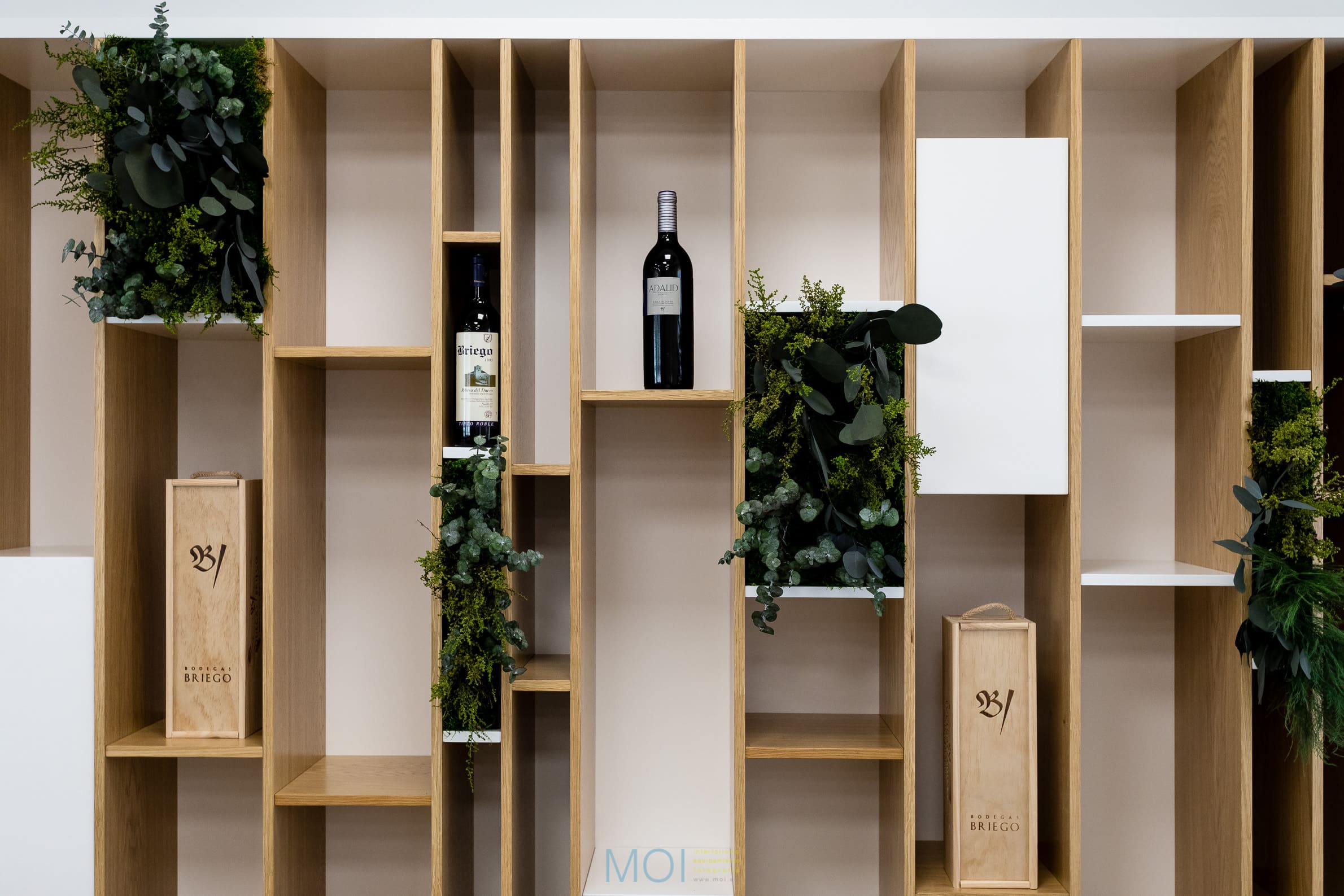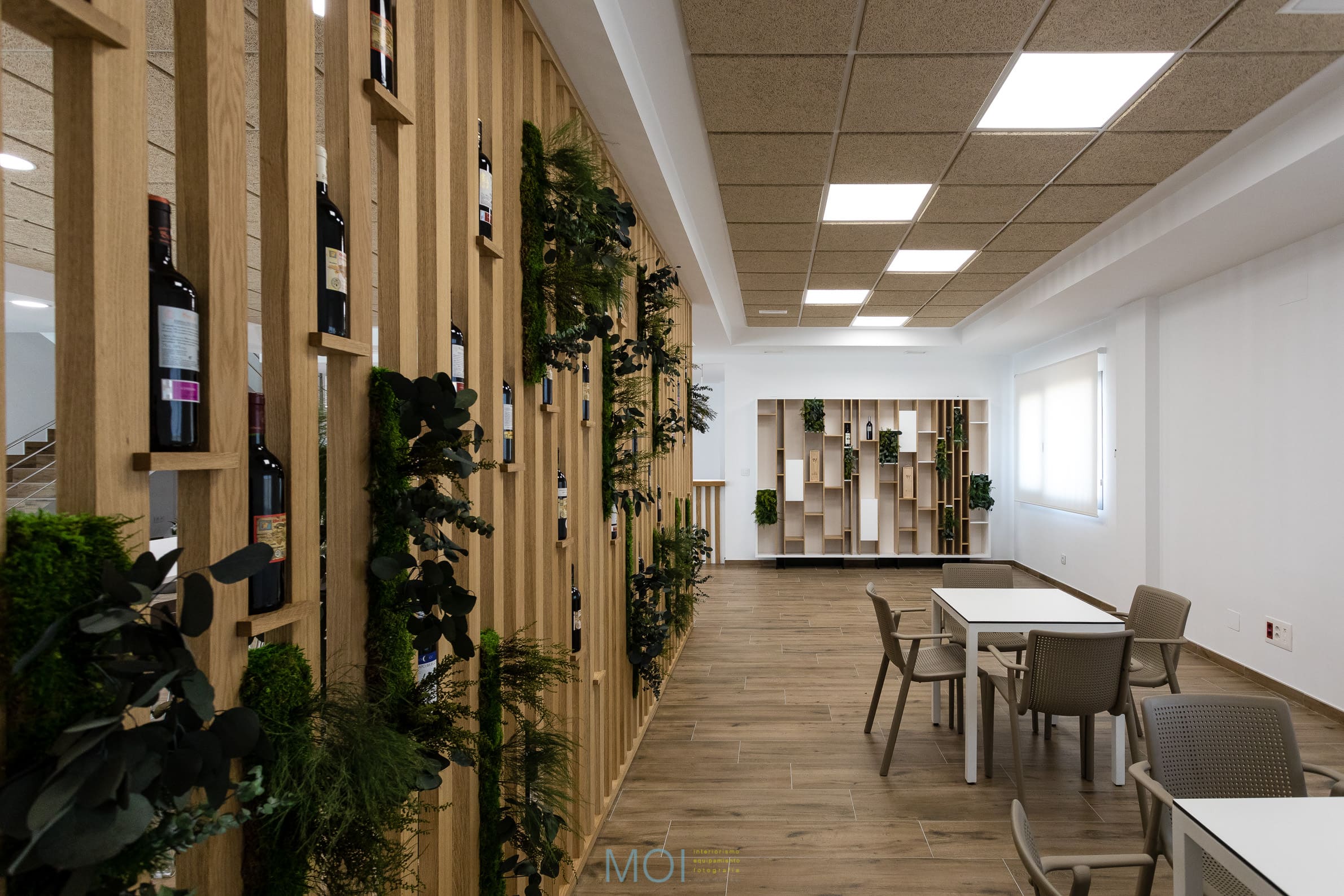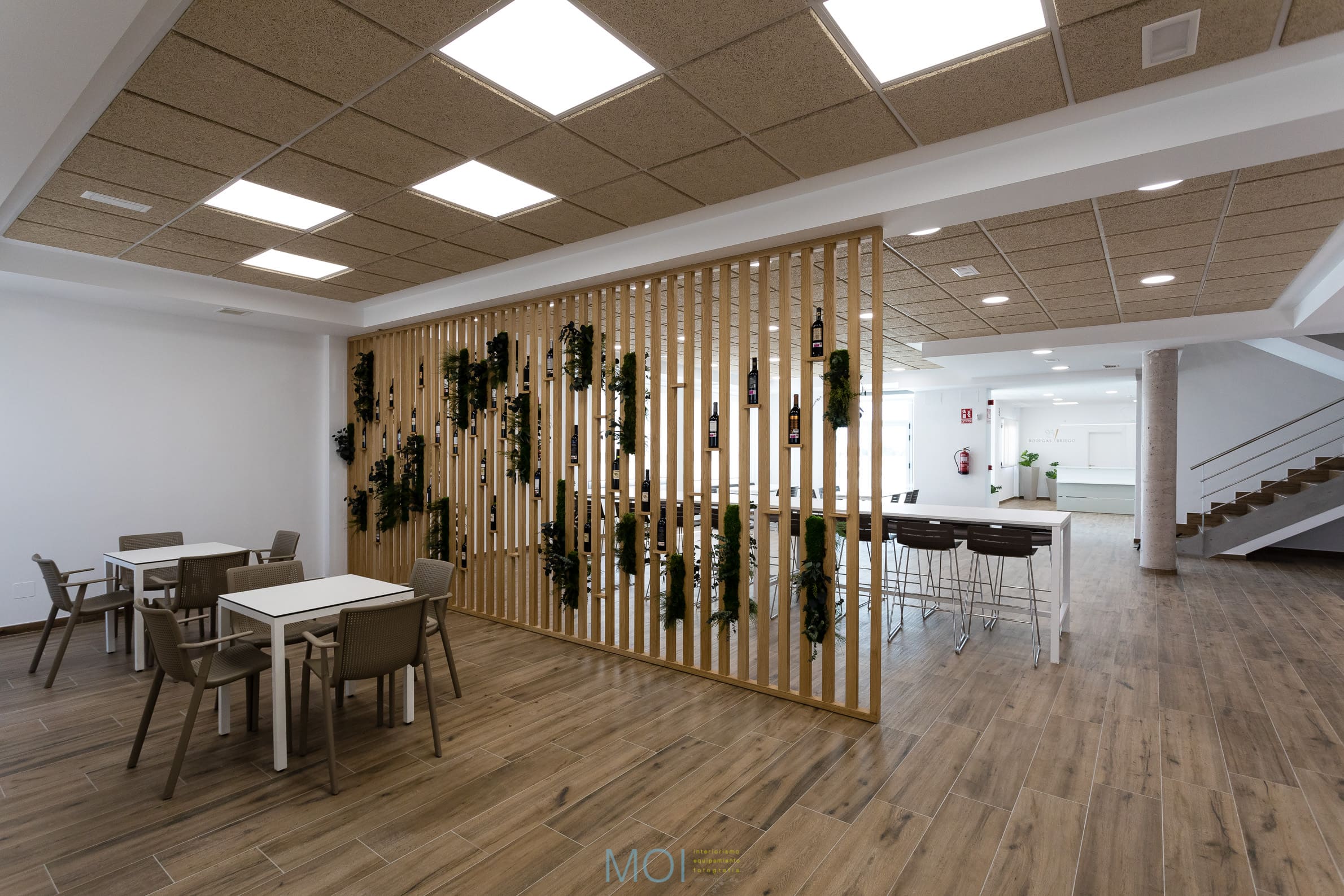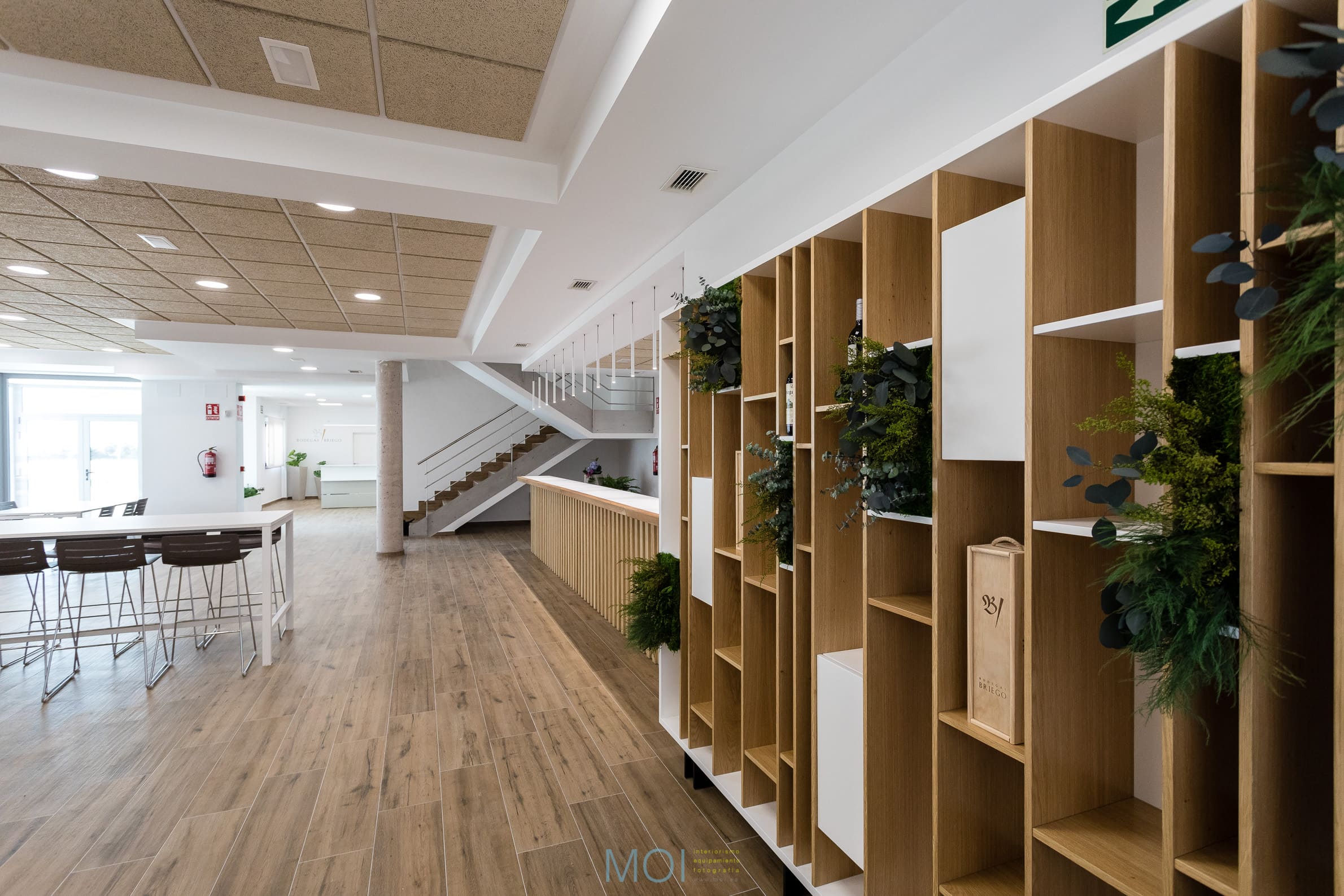 En Briego, MOI se ha ocupado del equipamiento integral del edificio: Mobiliario de oficina, mostradores, salas de catas, zonas de descanso, laboratorio, cocinas, comedores, mobiliario a medida, iluminación decorativa, complementos, jardines verticales, ebanistería, sistemas de oscurecimiento y control solar, alfombras… hasta los vinilos y el imponente logo de 20 metros de fachada.