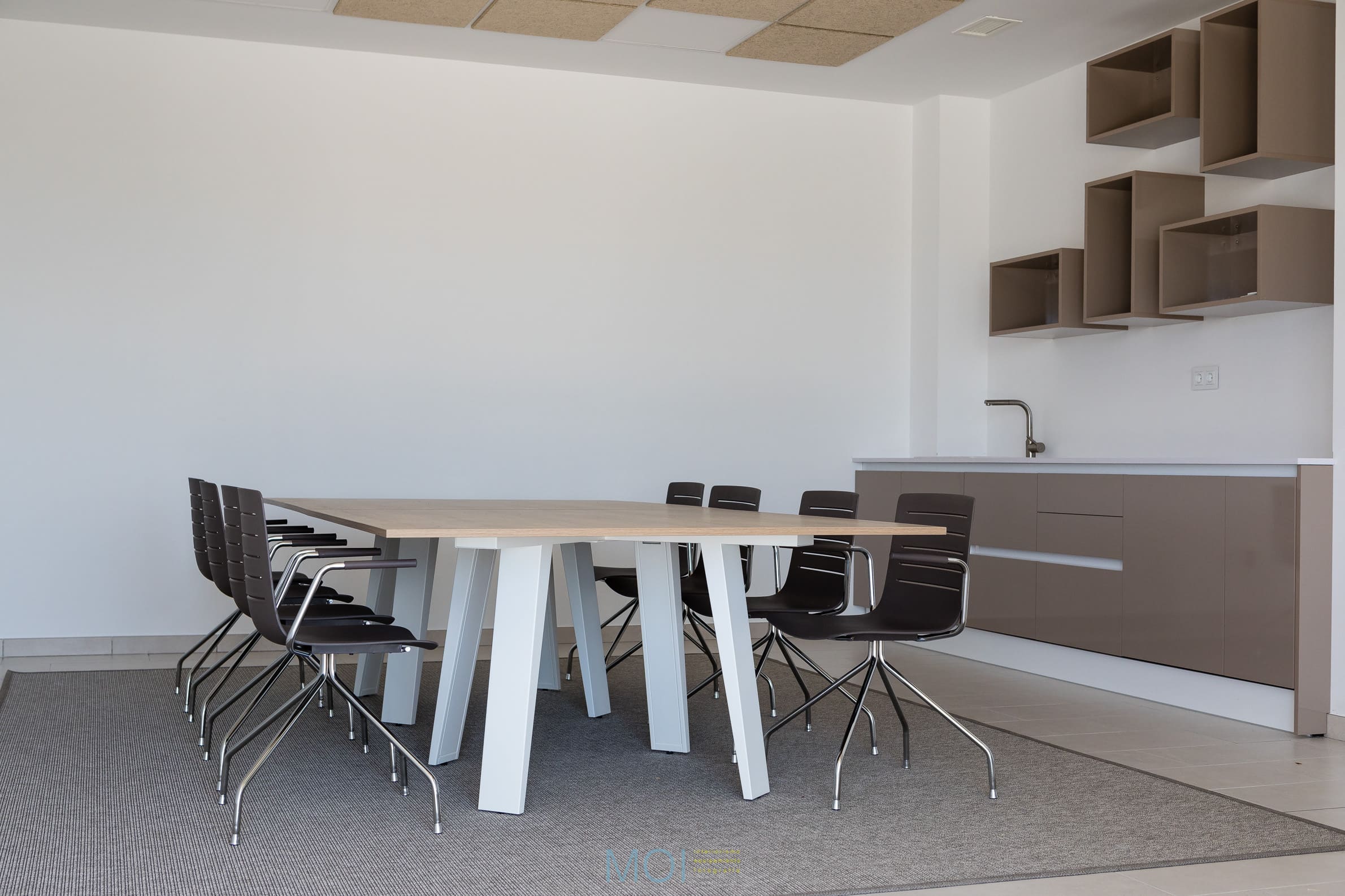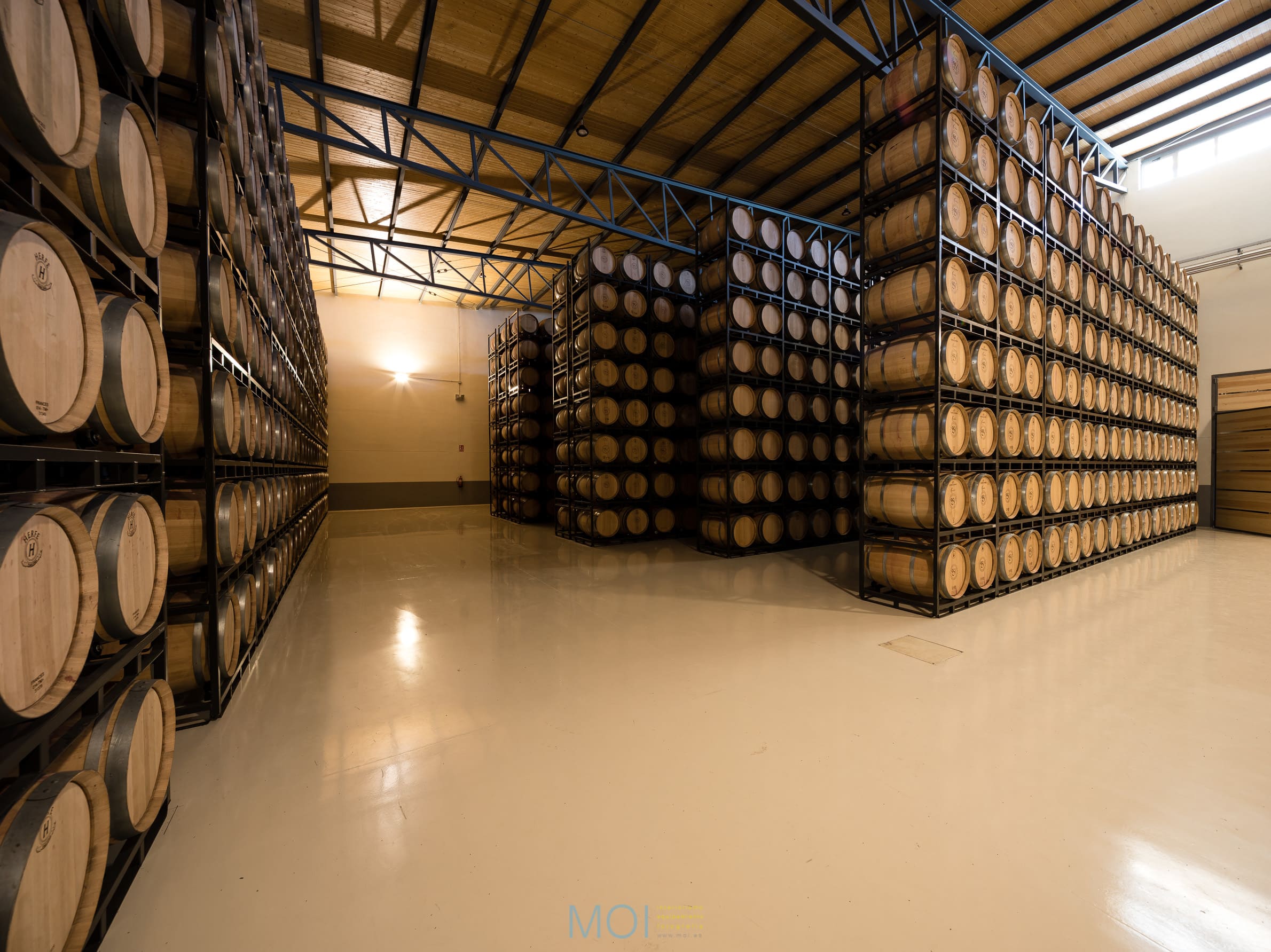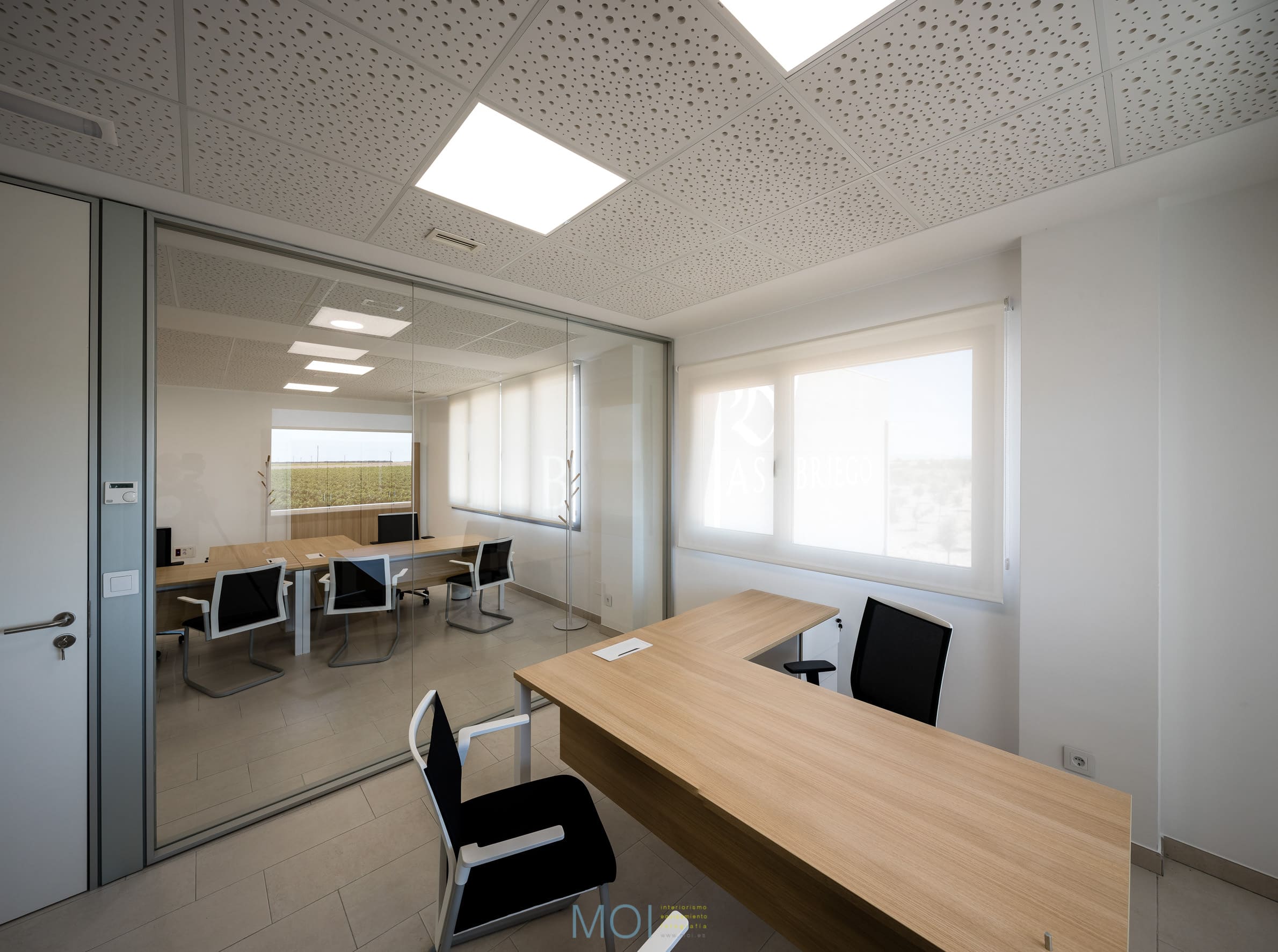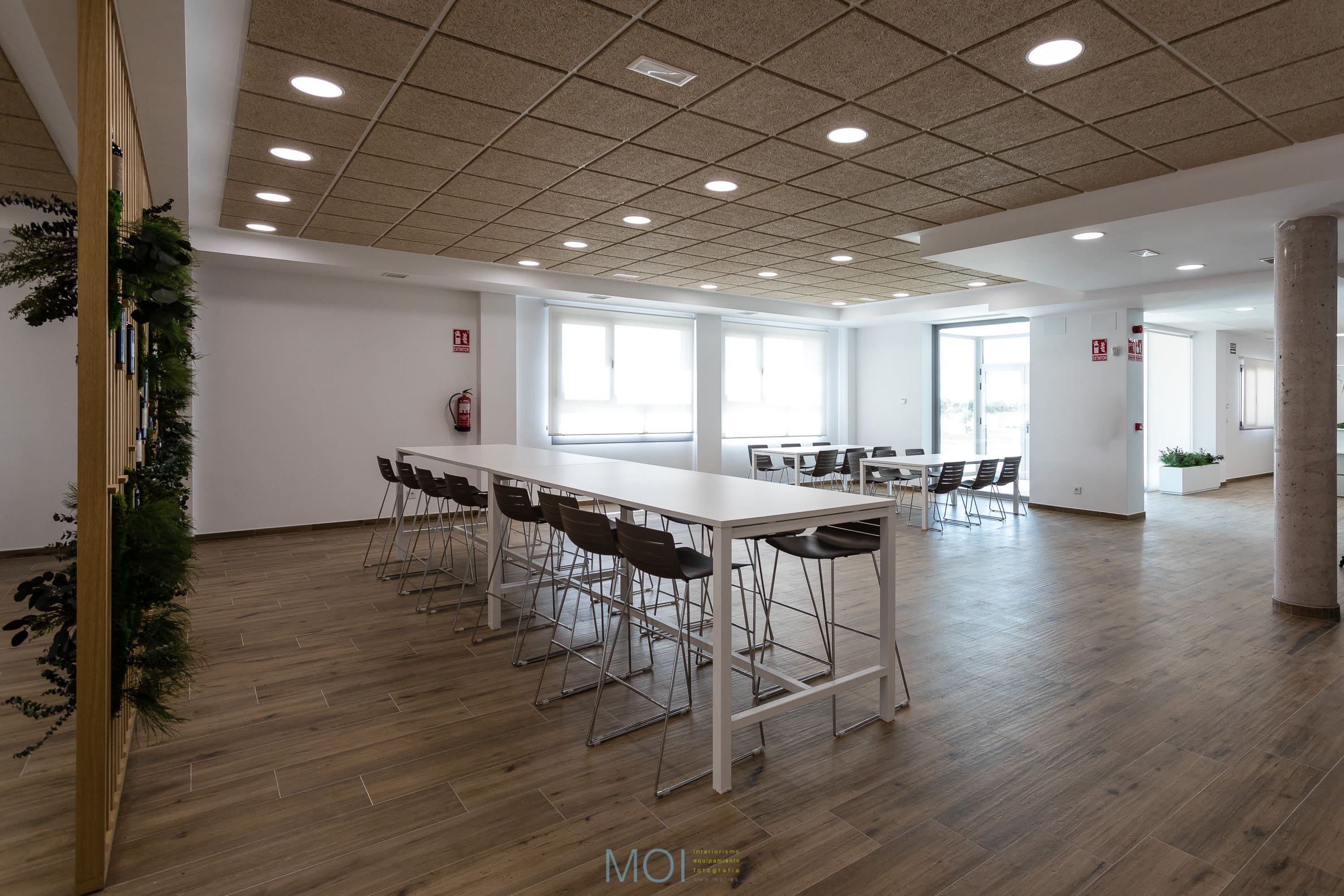 En Briego, MOI se ha ocupado del equipamiento integral del edificio: Mobiliario de oficina, mostradores, salas de catas, zonas de descanso, laboratorio, cocinas, comedores, mobiliario a medida, iluminación decorativa, complementos, jardines verticales, ebanistería, sistemas de oscurecimiento y control solar, alfombras… hasta los vinilos y el imponente logo de 20 metros de fachada.