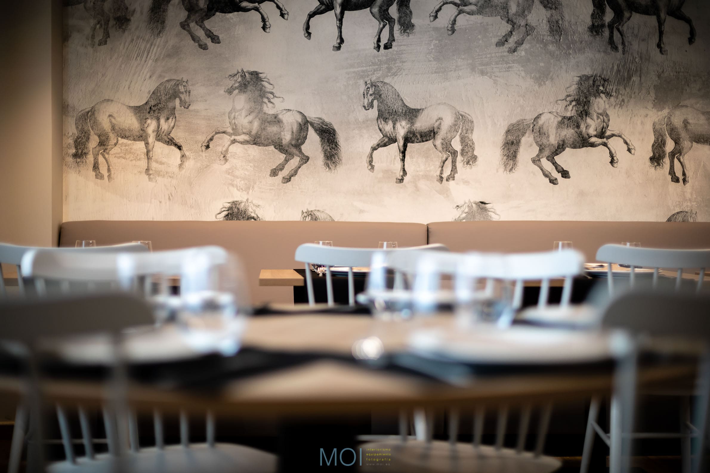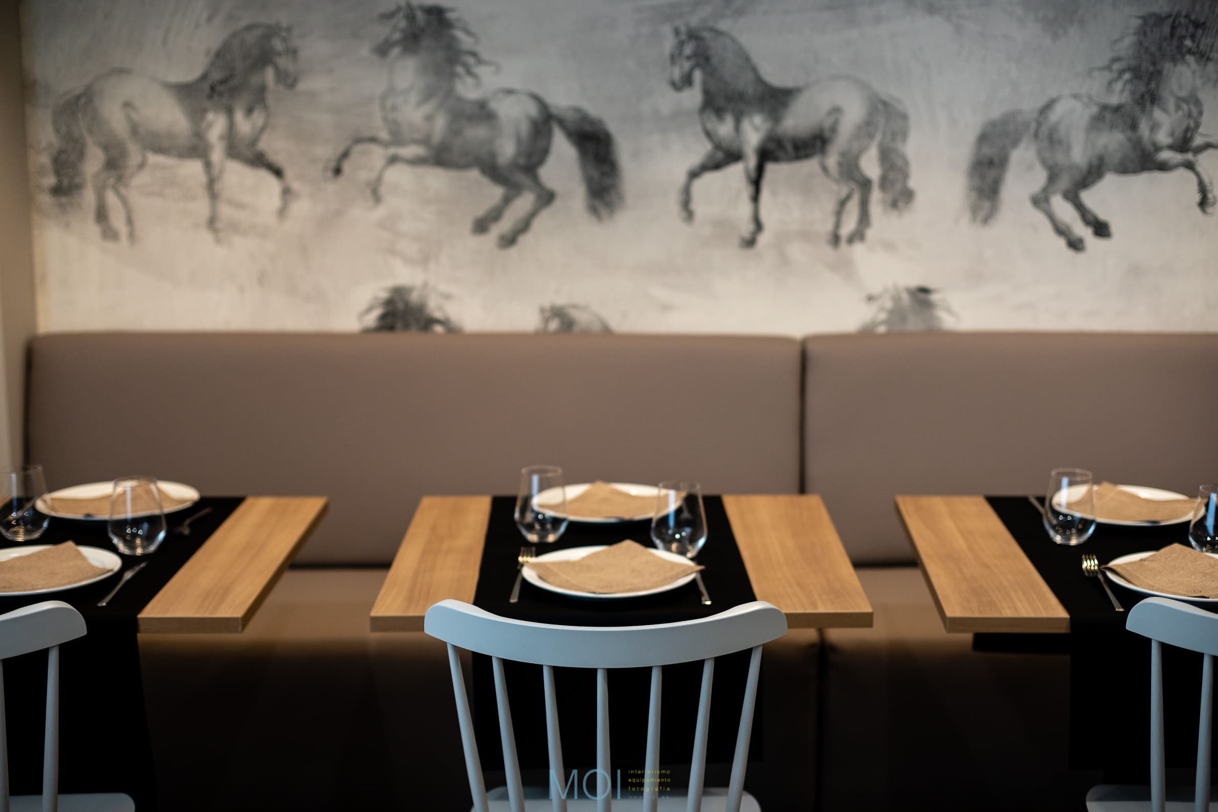 La elección del mobiliario, los colores, los acabados, los papeles pintados, las cortinas, el mobiliario a medida… Todo se relaciona para crear un conjunto homogéneo, acogedor y elegante donde disfrutar del placer de la buena gastronomía.