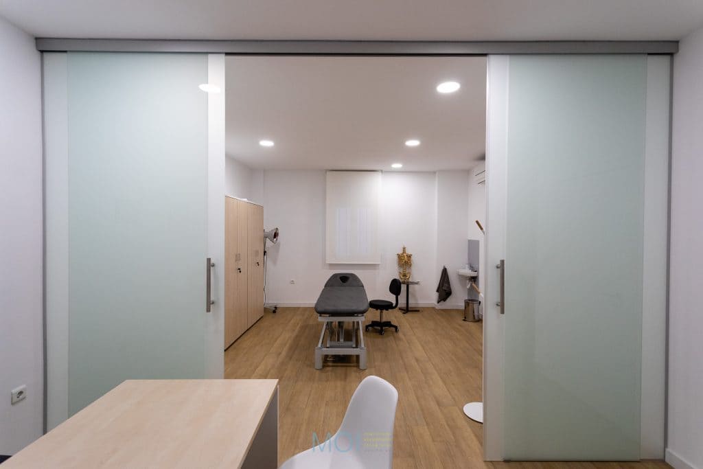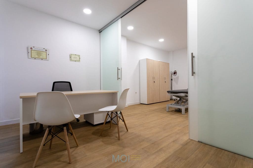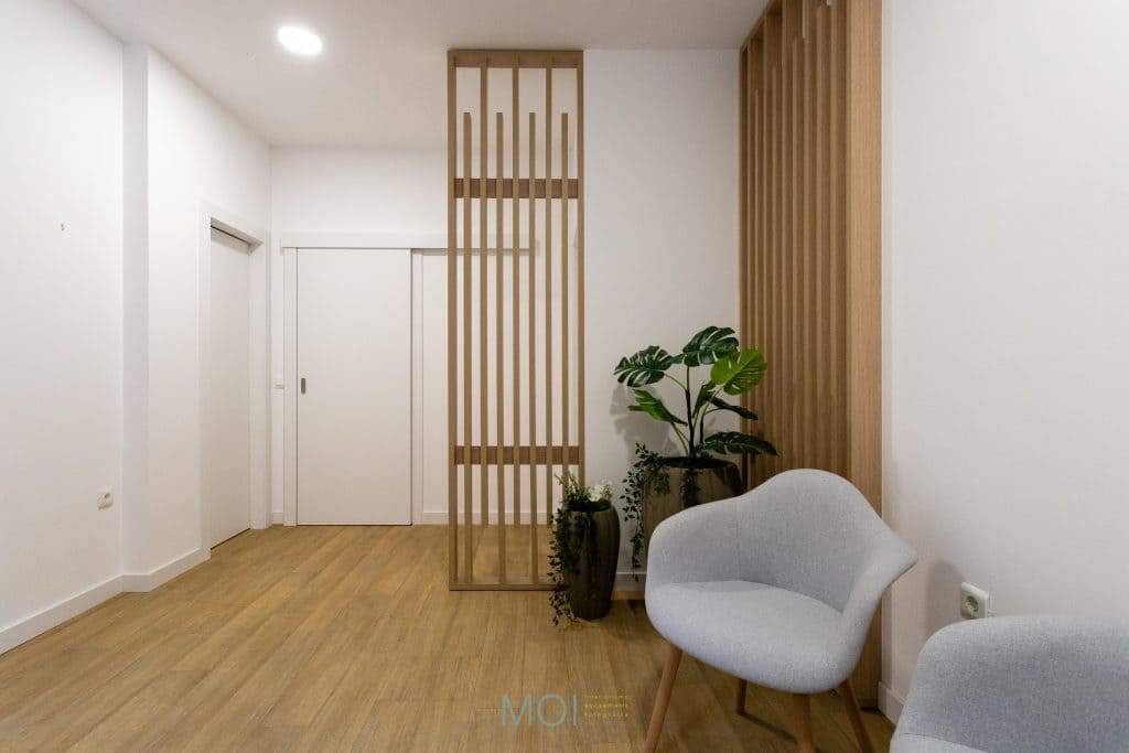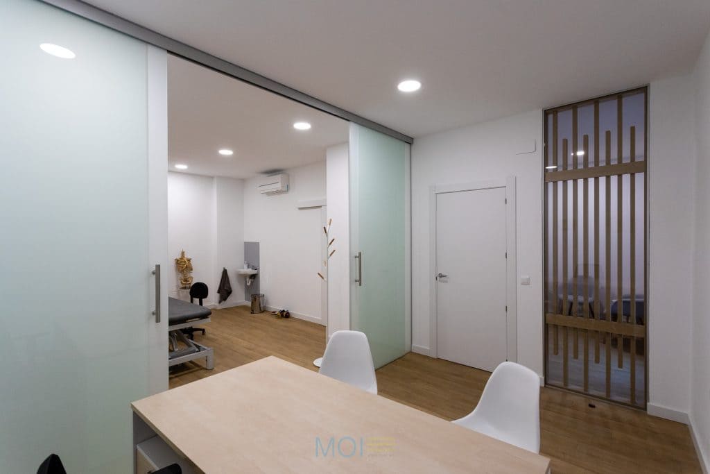 MOI ha realizado esta intervención para transformar un pequeño local destinado a tienda en una clínica de fisioterapia en Medina del Campo. Se ha buscado crear un espacio amable y acogedor en el que el paciente se sienta a gusto desde el primer momento. Debido a las pequeñas dimensiones y a la exigente normativa a cumplir se han articulado soluciones que permiten integrar unos espacios en otros, separaciones ligeras que tratan de no compartimentar las estancias sino de integrarlas.